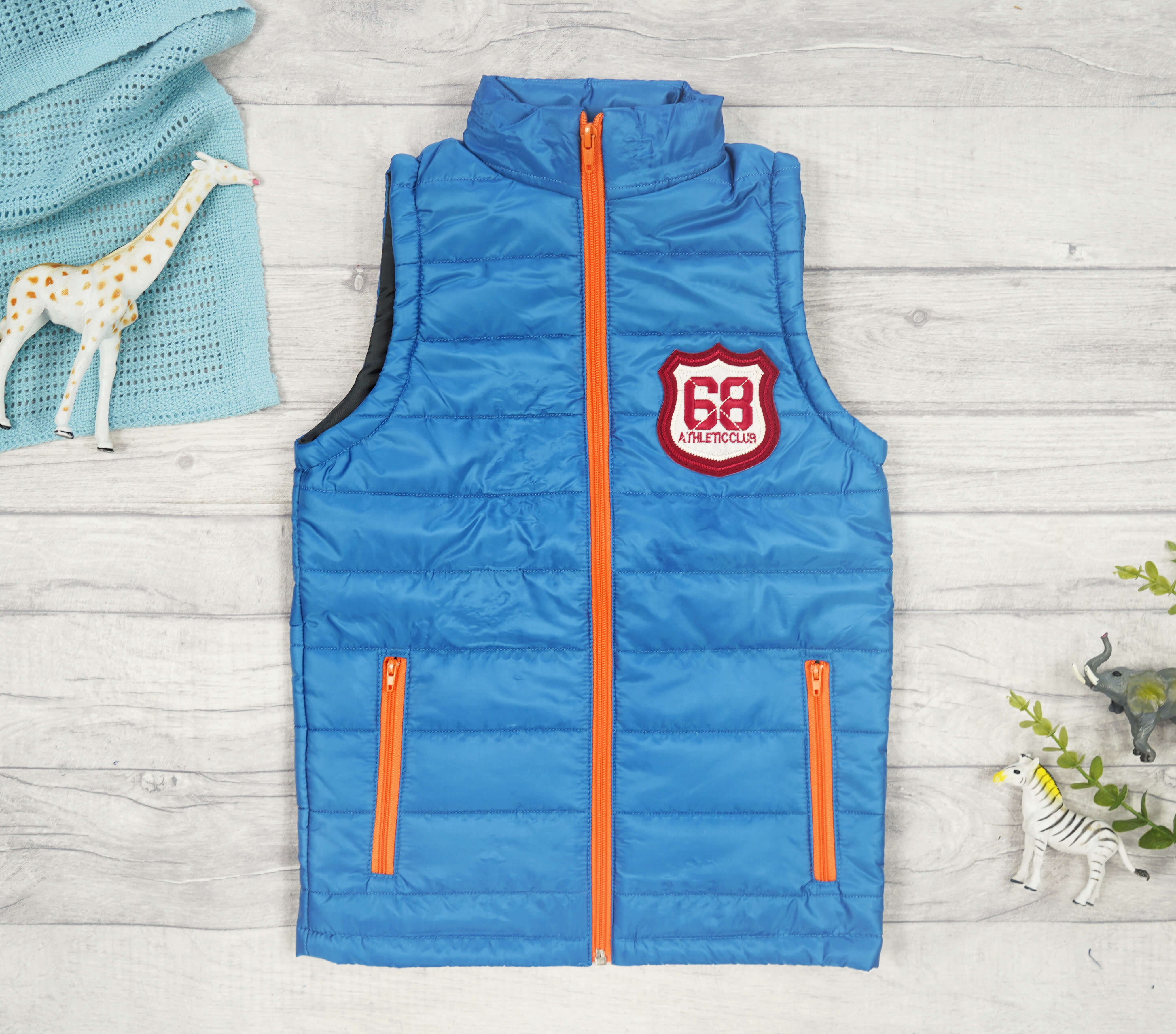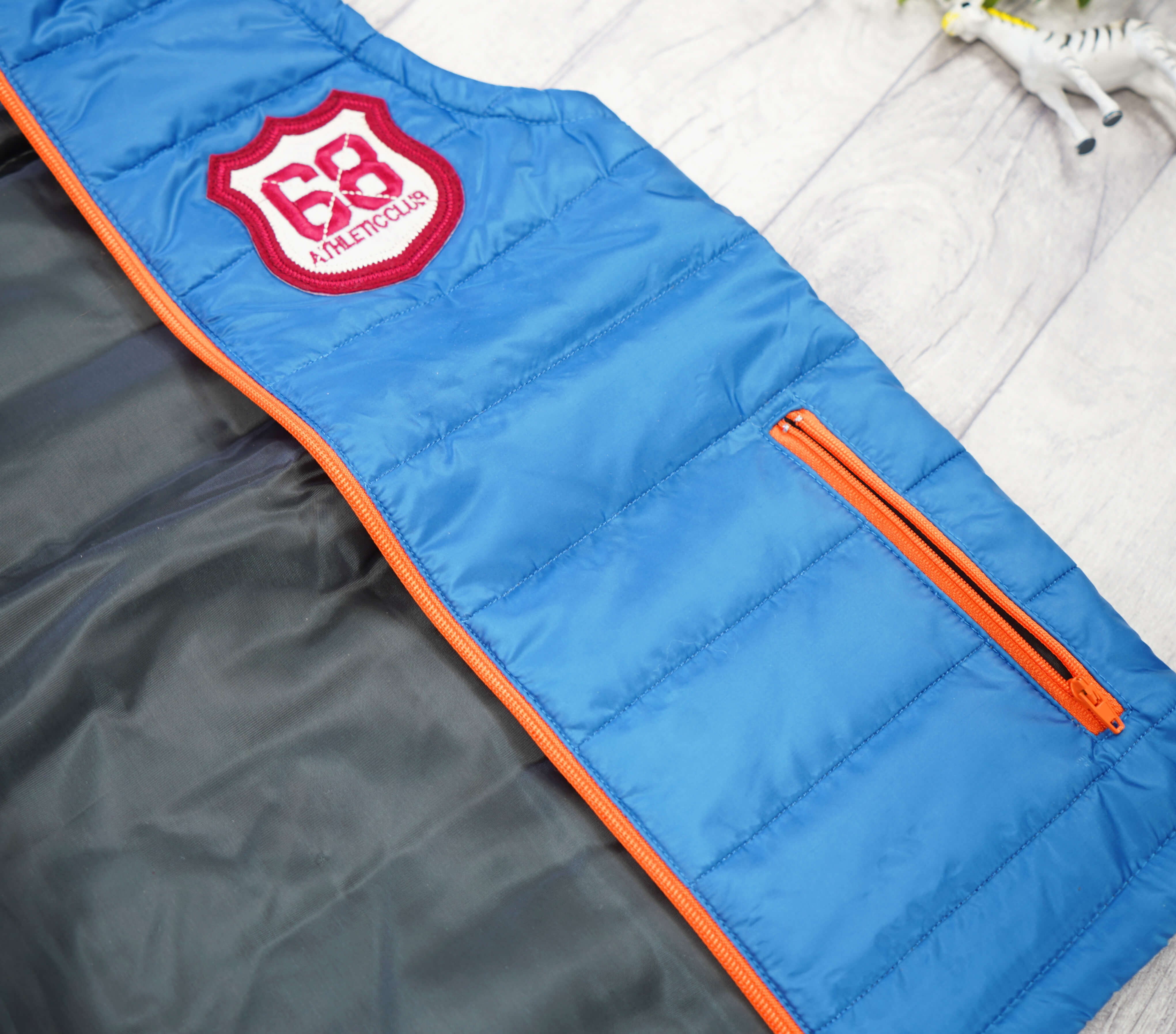 Kamizelka dziecięca zapinana na oryginalny, pomarańczowy suwak. Posiada dwie wpuszczane kieszenie również zamykane na suwaki. Zewnętrzna warstwa kamizelki dla chłopca jest nieprzemakalna. Zewnętrzna warstwa w kolorze niebieskim od wewnątrz czarnym. Ocieplona w całości cienkim wypełnieniem. Góra bezrękawnika wykończona jest stójką. Taki bezrękawnik możesz nosić zamiast kurtki, i ubierać go na bluzę albo sweter.