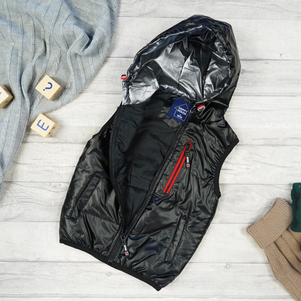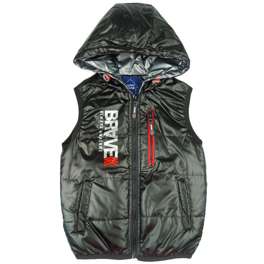 Kamizelka dziecięca zapinana na suwak. Posiada dwie wpuszczane kieszenie oraz jedną na piersi zamykaną na czerwony suwak. Zewnętrzna warstwa kamizelki dla chłopca jest nieprzemakalna. Kamizelka posiada kaptur od wewnątrz w kolorze metalicznym szarym, regulowany poprzez ściągacz. Taki bezrękawnik możesz nosić zamiast kurtki, i ubierać go na bluzę albo sweter.