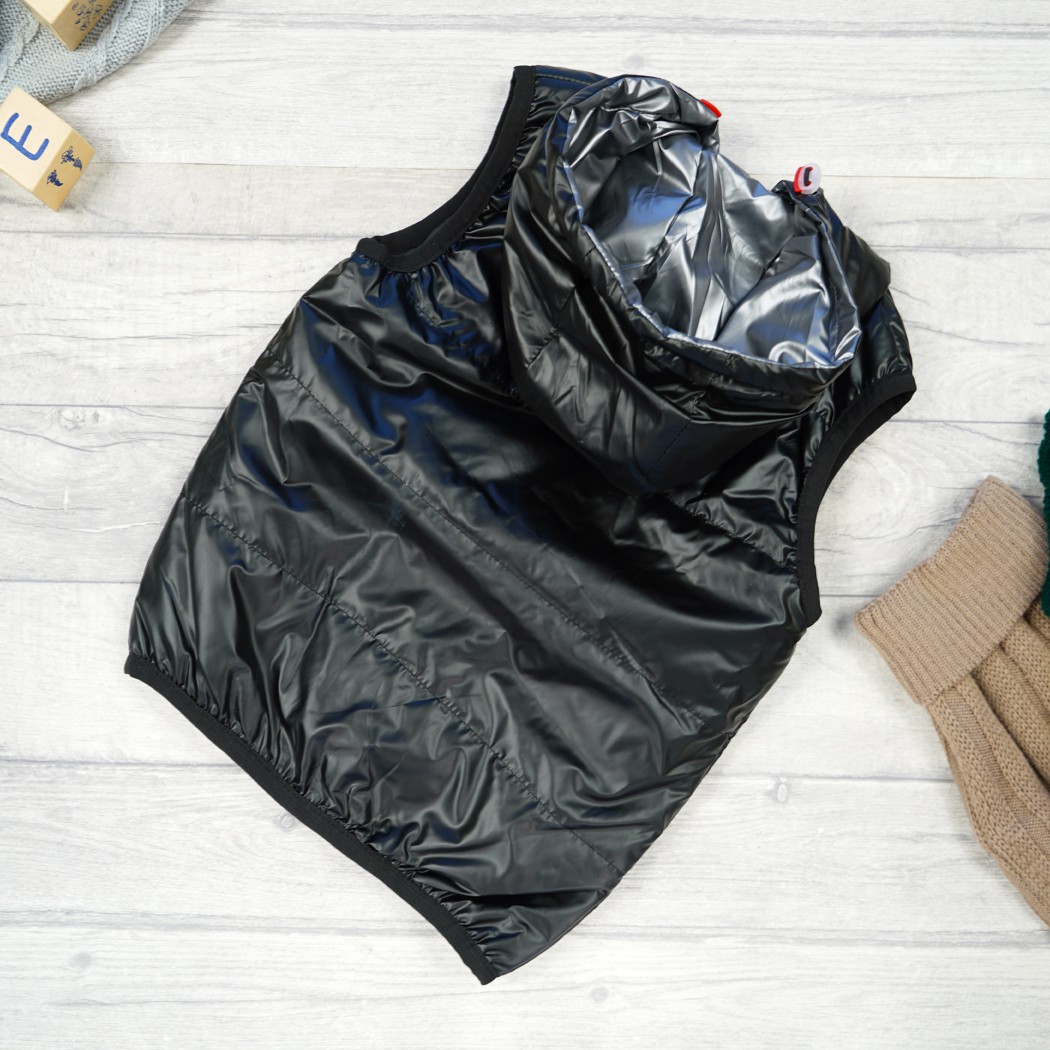 Bezrękawnik z kapturem w kolorze metalicznym czarnym.