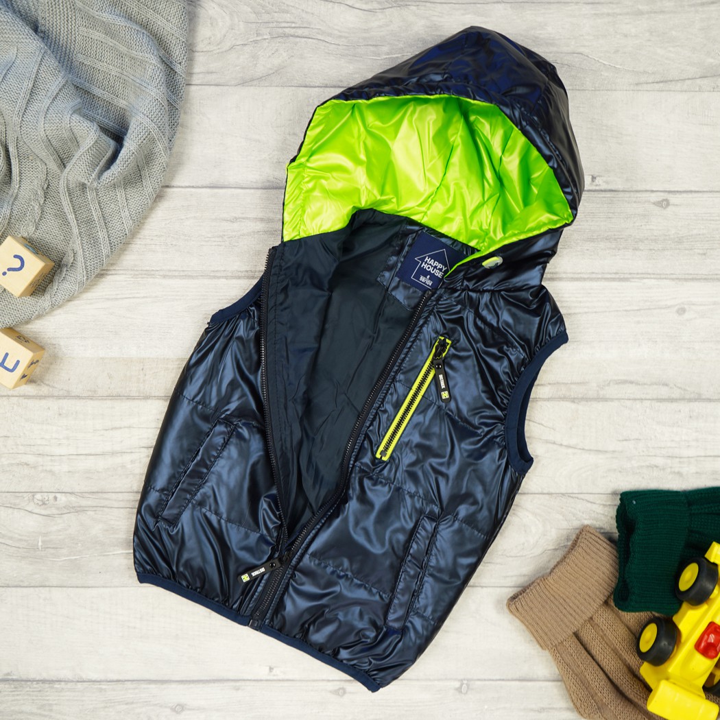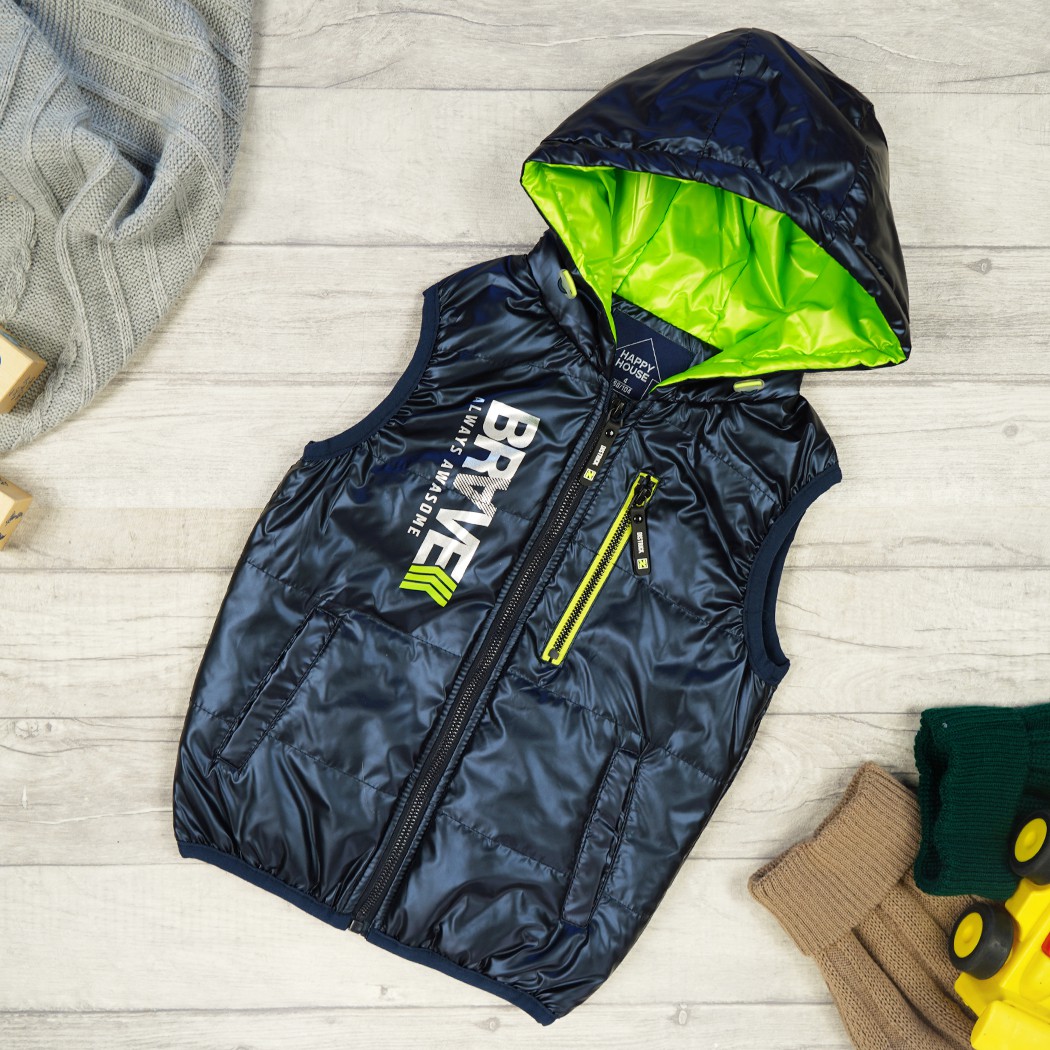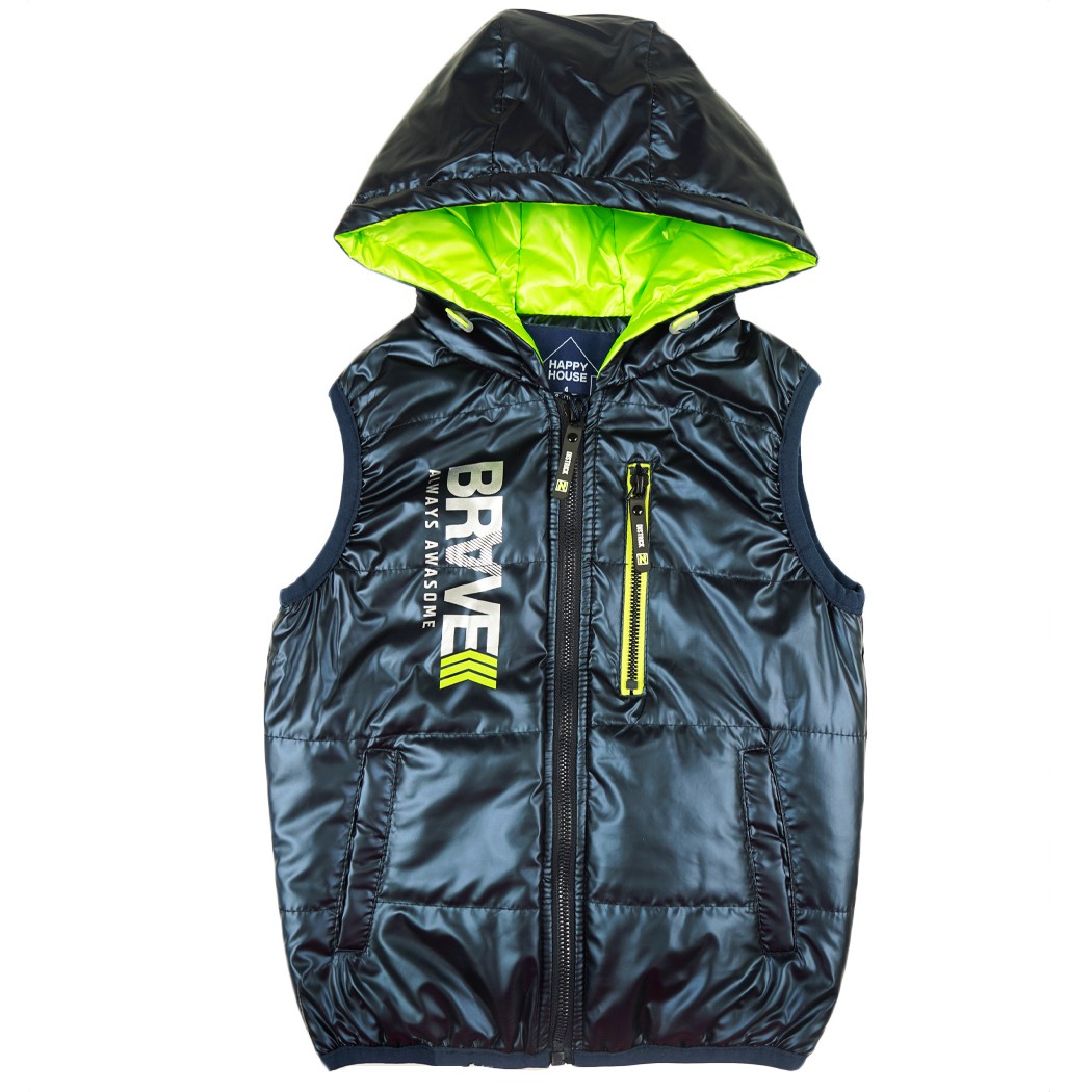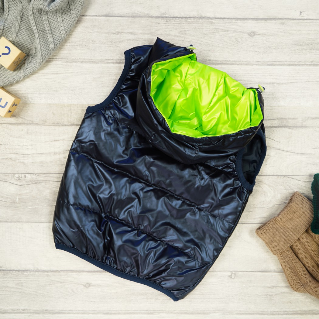 Kamizelka dziecięca zapinana na suwak. Posiada dwie wpuszczane kieszenie oraz jedną na piersi zamykaną na zielony, neonowy suwak. Zewnętrzna warstwa kamizelki dla chłopca jest nieprzemakalna. Kamizelka posiada kaptur od wewnątrz w kolorze zielonym, regulowany poprzez ściągacz. Taki bezrękawnik możesz nosić zamiast kurtki, i ubierać go na bluzę albo sweter.