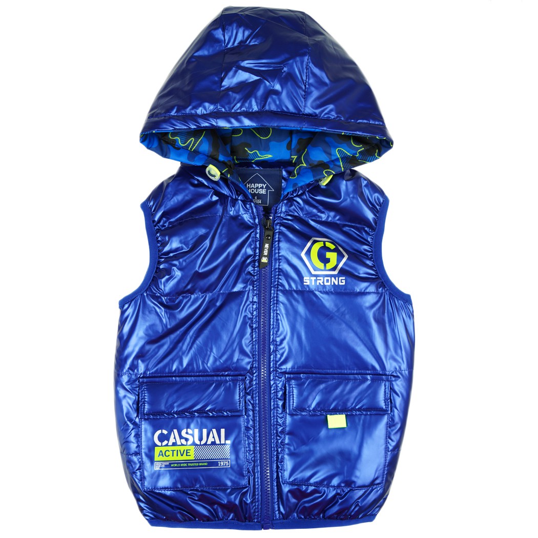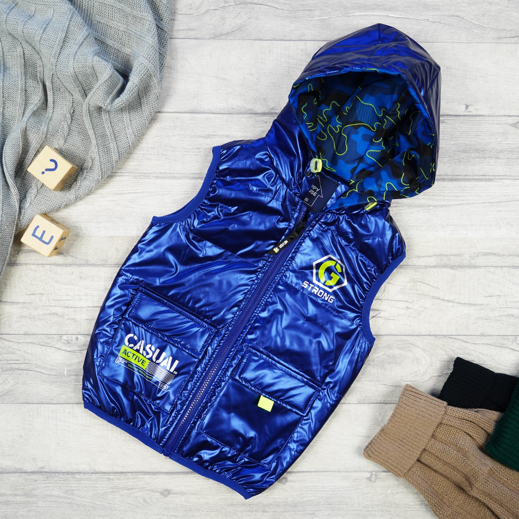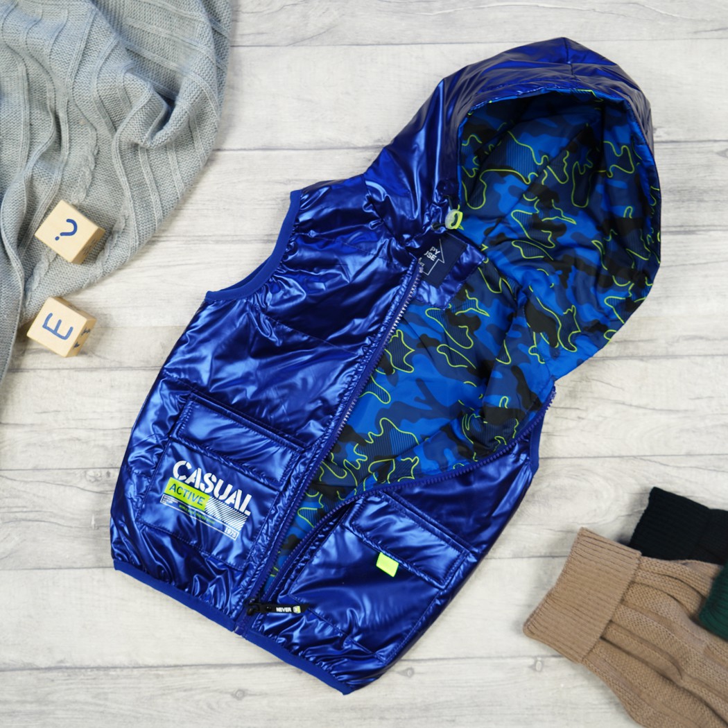 Kamizelka dziecięca zapinana na suwak. Posiada dwie kieszenie z klapkami zamykane na rzep oraz regulowany ściągaczami kaptur. Zewnętrzna warstwa kamizelki dziecięcej jest nieprzemakalna, a wewnętrzna wykonana jest z materiału typu moro. Taki bezrękawnik możesz nosić zamiast kurtki, i ubierać go na bluzę albo sweter.