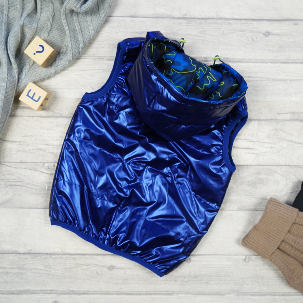 Bezrękawnik z kapturem w kolorze metalicznym niebieskim.