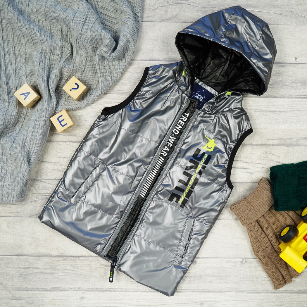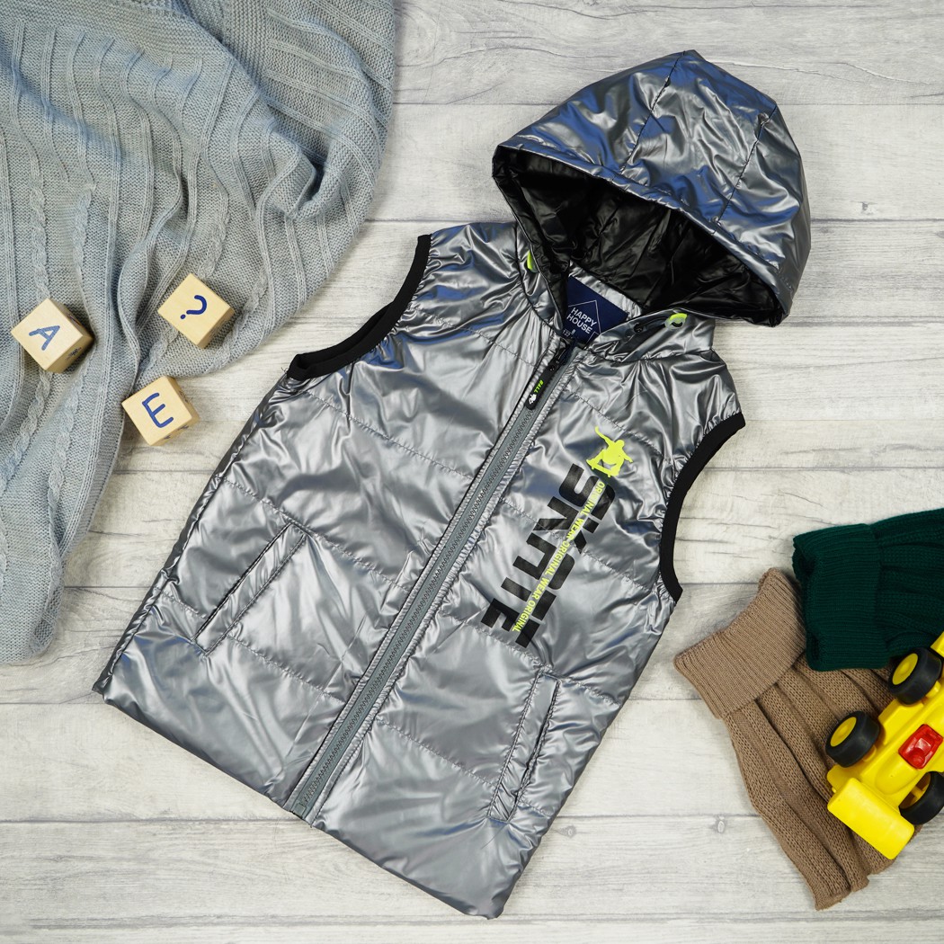 Kamizelka dziecięca zapinana na suwak. Posiada dwie wpuszczane kieszenie, wykończona ściągającą gumkę przy ramionach. Zewnętrzna warstwa kamizelki dla chłopca jest nieprzemakalna. Kamizelka posiada kaptur od wewnątrz w kolorze metalicznym czarnym, regulowany poprzez ściągacz. Taki bezrękawnik możesz nosić zamiast kurtki, i ubierać go na bluzę albo sweter.