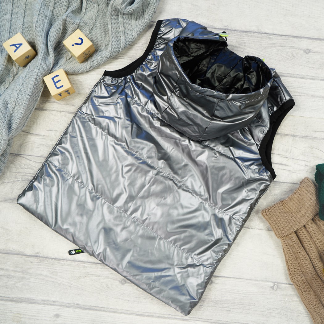 Bezrękawnik z kapturem w kolorze metalicznym szarym.
