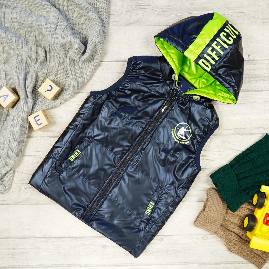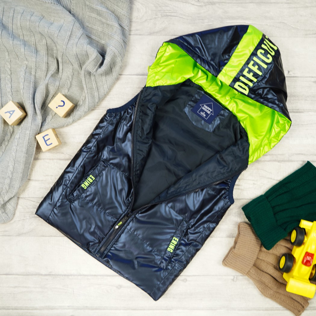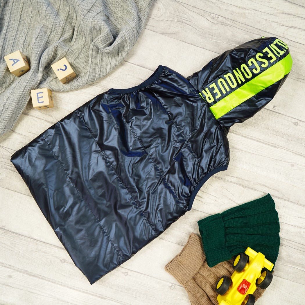 Kamizelka dziecięca zapinana na suwak. Posiada dwie wpuszczane kieszenie, wykończona ściągającą gumkę przy ramionach. Zewnętrzna warstwa kamizelki dla chłopca jest nieprzemakalna. Kamizelka posiada kaptur od wewnątrz w kolorze metalicznym zielonym, regulowany poprzez ściągacz. Taki bezrękawnik możesz nosić zamiast kurtki, i ubierać go na bluzę albo sweter.