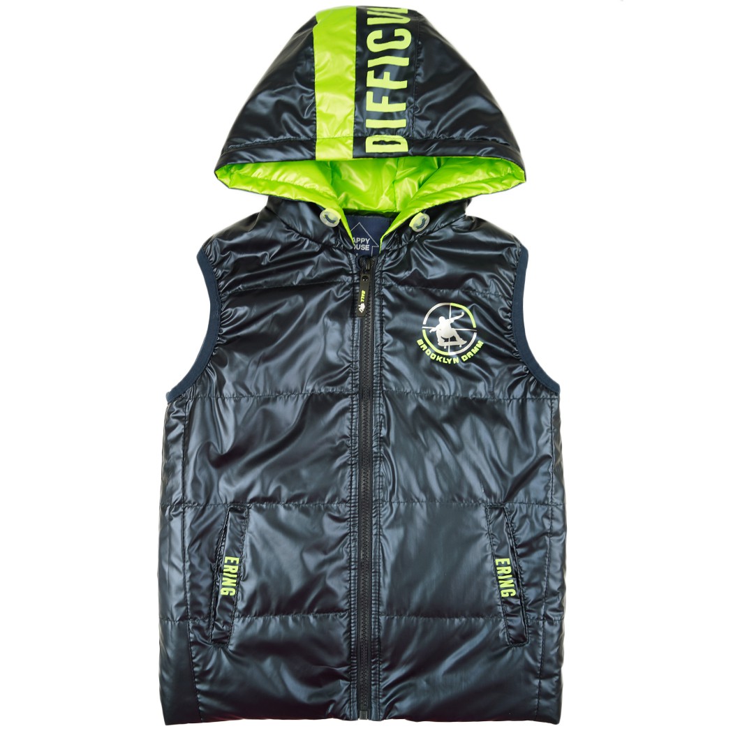 Elementem ozdobnym tego chłopięcego bezrękawnika jest zielony nadruk na piersi, przy kieszeniach oraz wzdłuż kaptura. Jego krój umożliwia całkowite rozpięcie a ubranko jest funkcjonalne i wygodne.