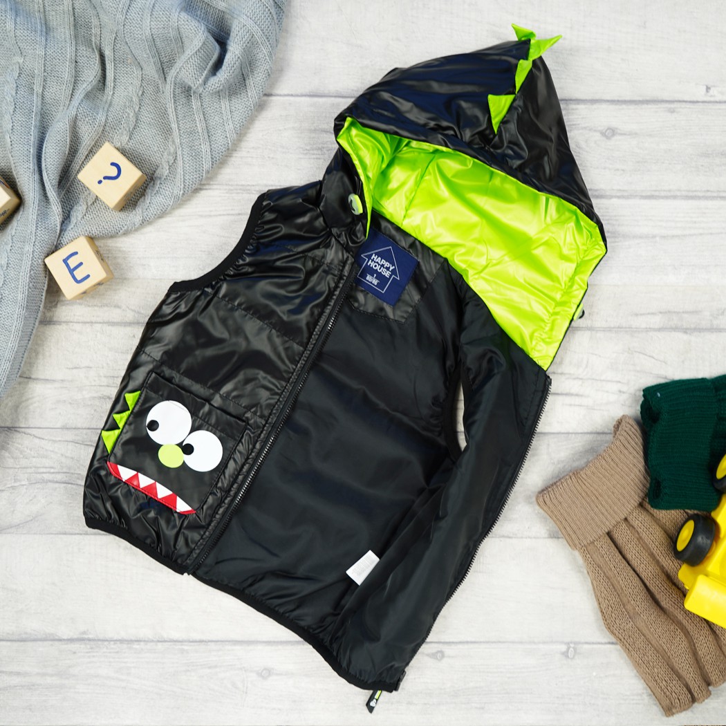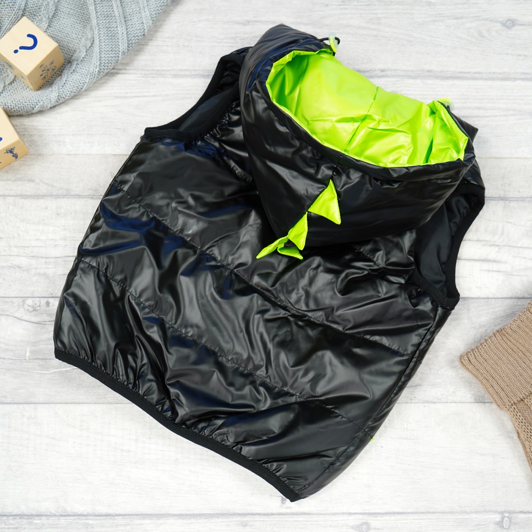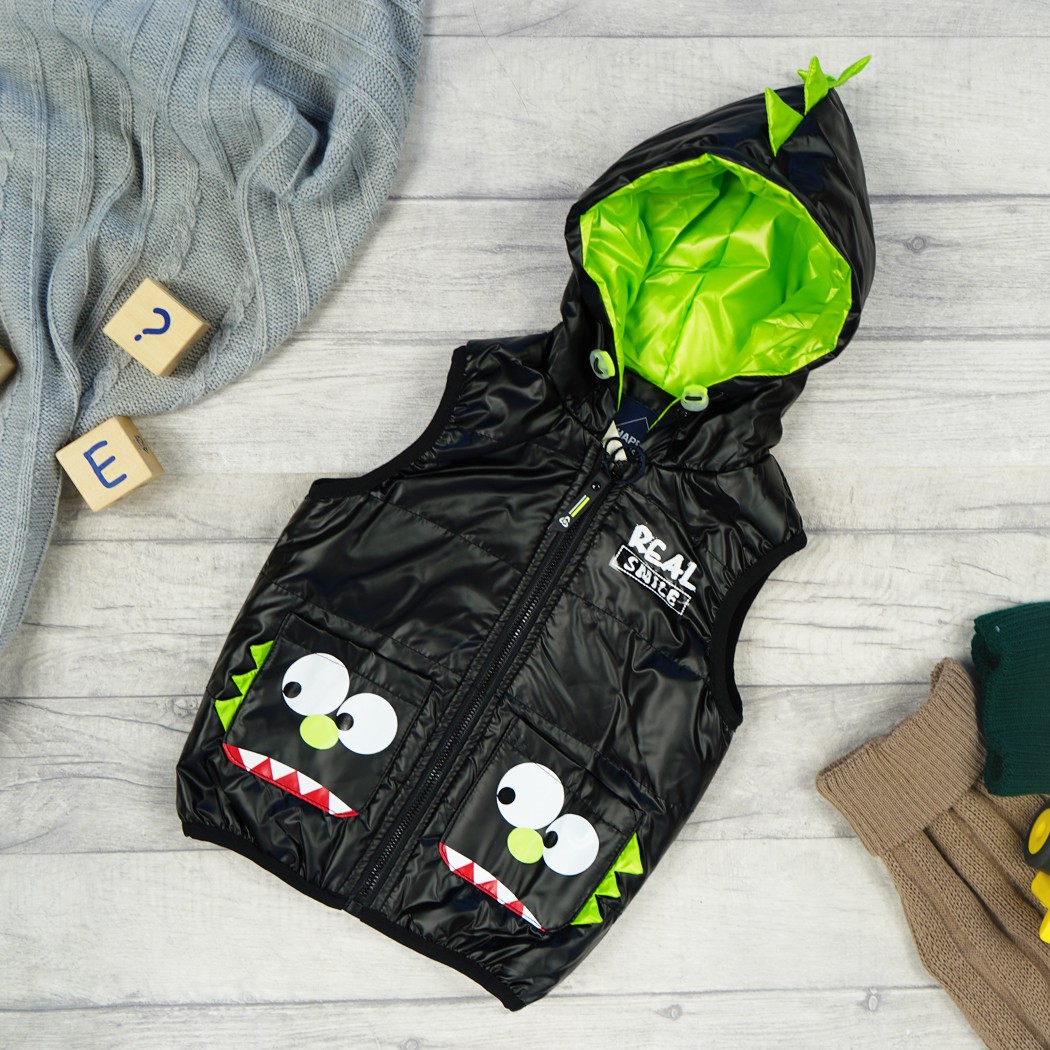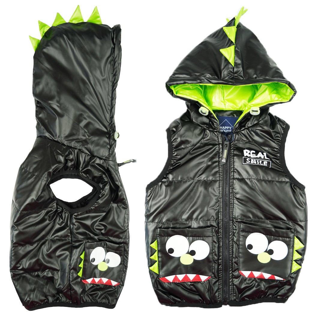 Kamizelka dziecięca zapinana na suwak. Posiada dwie wpuszczane kieszenie- potworki z motywem 3d. Regulowany ściągaczami kaptur posiada ozdobny motyw dinozaura 3d oraz wnętrze w kolorze zielonym. Zewnętrzna warstwa kamizelki dziecięcej jest nieprzemakalna, wykończona ściągającą gumką na dole oraz przy ramionach. Taki bezrękawnik możesz nosić zamiast kurtki, i ubierać go na bluzę albo sweter.
