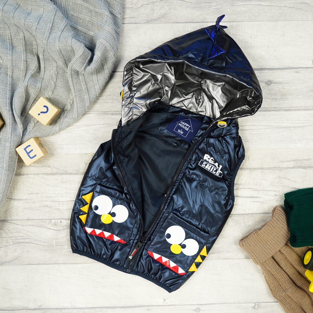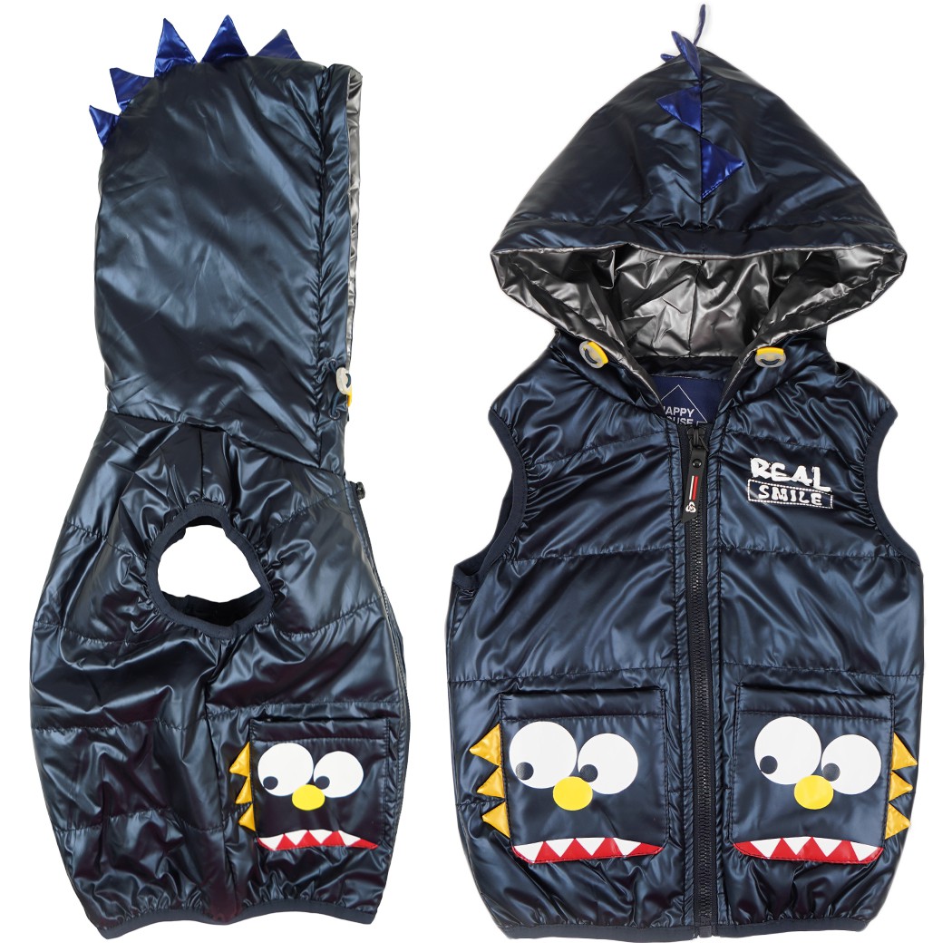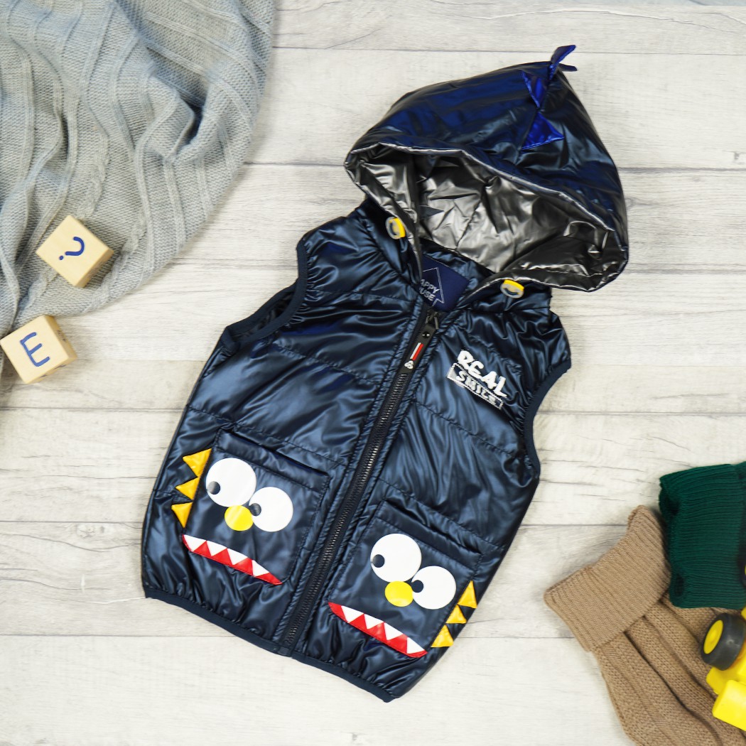 Kamizelka dziecięca zapinana na suwak. Posiada dwie wpuszczane kieszenie- potworki z motywem 3d. Regulowany ściągaczami kaptur posiada ozdobny motyw dinozaura 3d oraz wnętrze w kolorze srebrnym. Zewnętrzna warstwa kamizelki dziecięcej jest nieprzemakalna, wykończona ściągającą gumką na dole oraz przy ramionach. Taki bezrękawnik możesz nosić zamiast kurtki, i ubierać go na bluzę albo sweter.