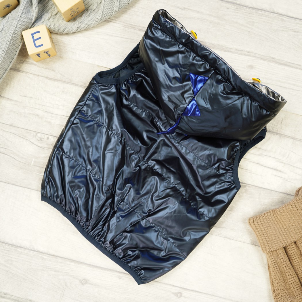 Bezrękawnik z kapturem w kolorze metalicznym granatowym.