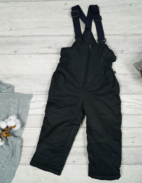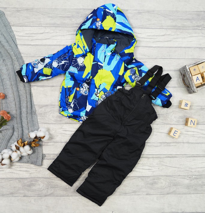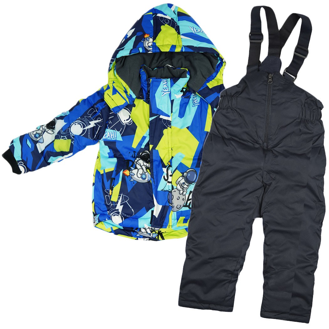 Kombinezon zimowy dla dziecka, w skład którego wchodzą: zapinana na suwak i rzepy ciepła, granatowo- błękitna kurtka zimowa w napisy "YEAH" oraz czarne spodnie typu narciarskiego.