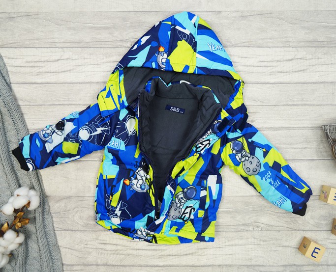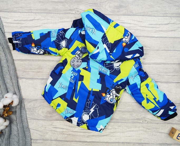 Dostępna w zestawie kurtka zimowa wykonana z warstwy nieprzemakalnej od strony zewnętrznej oraz ocieplona od wewnątrz miękkim szarym polarem. Posiada ona stójkę osłaniającą szyję dziecka oraz odsuwany kaptur wyposażony w zapięcie na rzep. Kaptur kurtki również został ocieplony polarem. Dwie wbudowane kieszenie, rękawy wykończone doszytym wewnątrz ściągaczem.