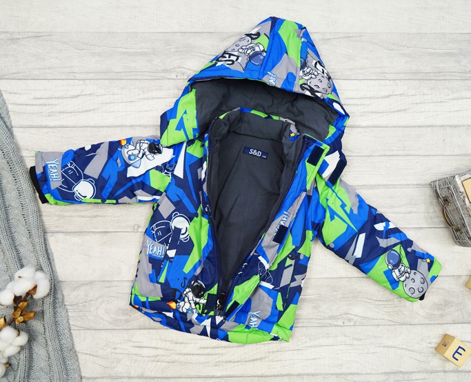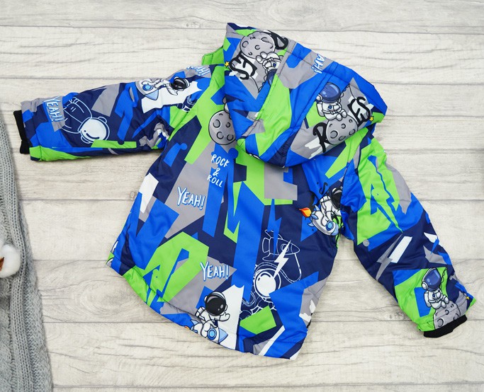 Dostępna w zestawie kurtka zimowa wykonana z warstwy nieprzemakalnej od strony zewnętrznej oraz ocieplona od wewnątrz miękkim szarym polarem. Posiada ona stójkę osłaniającą szyję dziecka oraz odsuwany kaptur wyposażony w zapięcie na rzep. Kaptur kurtki również został ocieplony polarem. Dwie wbudowane kieszenie, rękawy wykończone doszytym wewnątrz ściągaczem.