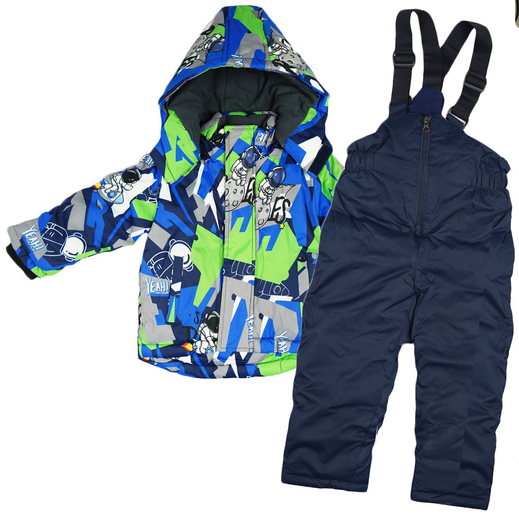 Kombinezon zimowy dla dziecka, w skład którego wchodzą: zapinana na suwak i rzepy ciepła, granatowo- szara kurtka zimowa w napisy "YEAH" oraz granatowe spodnie typu narciarskiego.