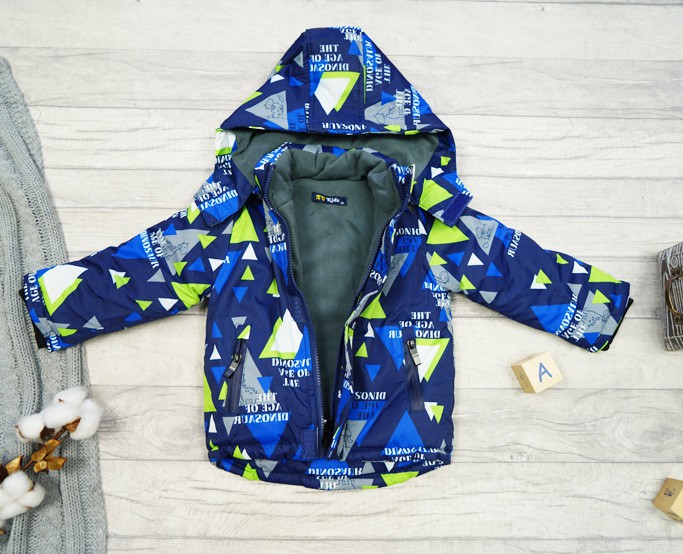 Dostępna w zestawie kurtka zimowa wykonana z warstwy nieprzemakalnej od strony zewnętrznej oraz ocieplona od wewnątrz miękkim szarym polarem. Posiada ona stójkę osłaniającą szyję dziecka oraz odsuwany kaptur wyposażony w zapięcie na rzep. Kaptur kurtki również został ocieplony polarem. Dwie wbudowane kieszenie oraz rękawy wykończone doszytym wewnątrz ściągaczem.