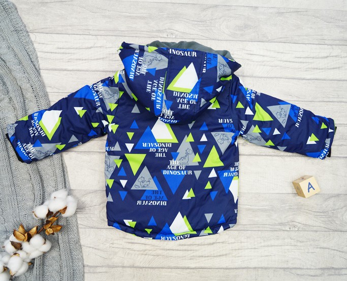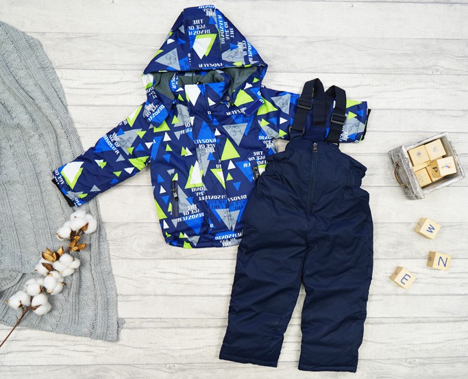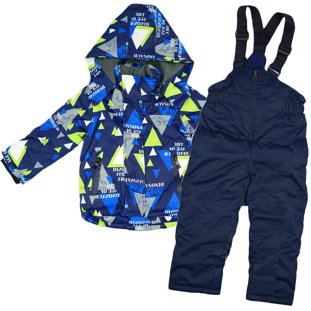 Kombinezon zimowy dla dziecka, w skład którego wchodzą: zapinana na suwak i rzepy ciepła, granatowa kurtka zimowa w zielone trójkąty i napisy "DINOSAUR" oraz granatowe spodnie typu narciarskiego.