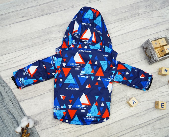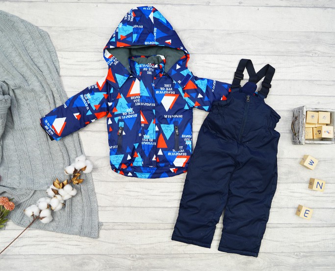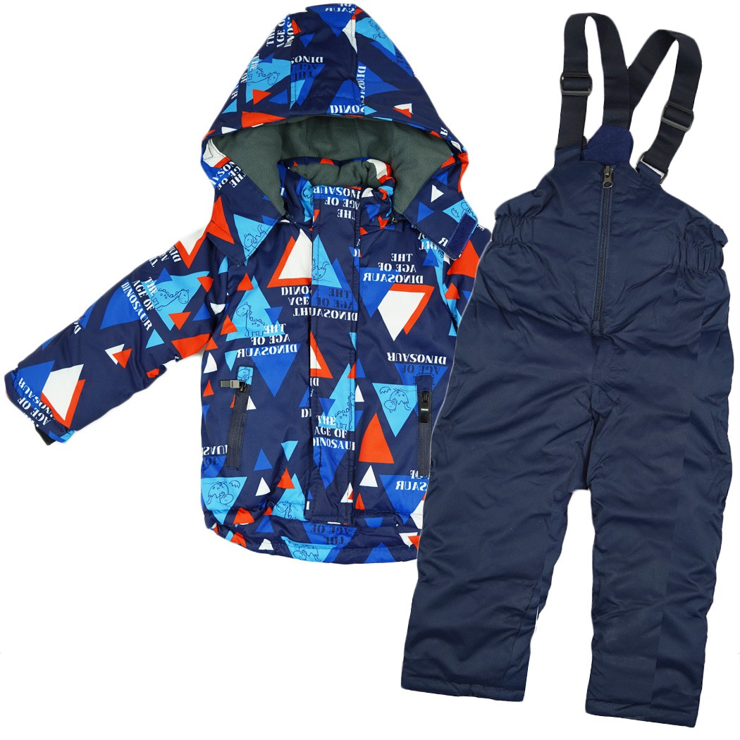Kombinezon zimowy dla dziecka, w skład którego wchodzą: zapinana na suwak i rzepy ciepła, granatowa kurtka zimowa w xzerwone trójkąty i napisy "DINOSAUR" oraz granatowe spodnie typu narciarskiego.