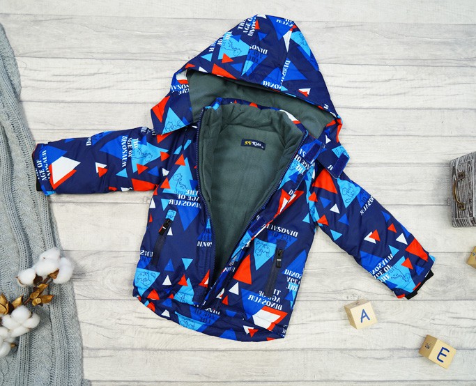Dostępna w zestawie kurtka zimowa wykonana z warstwy nieprzemakalnej od strony zewnętrznej oraz ocieplona od wewnątrz miękkim szarym polarem. Posiada ona stójkę osłaniającą szyję dziecka oraz odsuwany kaptur wyposażony w zapięcie na rzep. Kaptur kurtki również został ocieplony polarem. Dwie wbudowane kieszenie oraz rękawy wykończone doszytym wewnątrz ściągaczem.