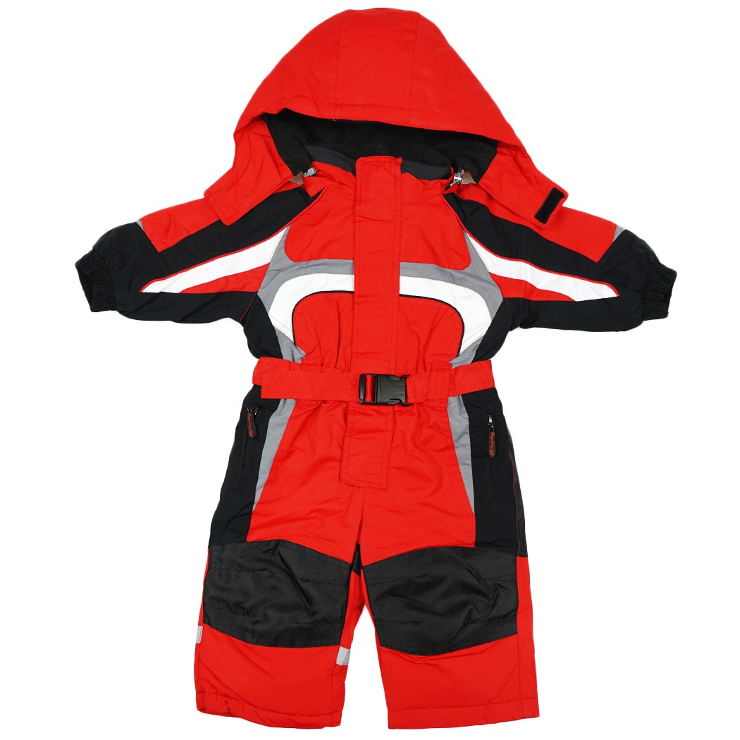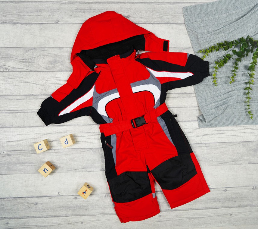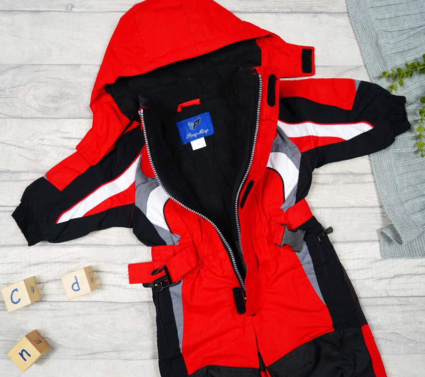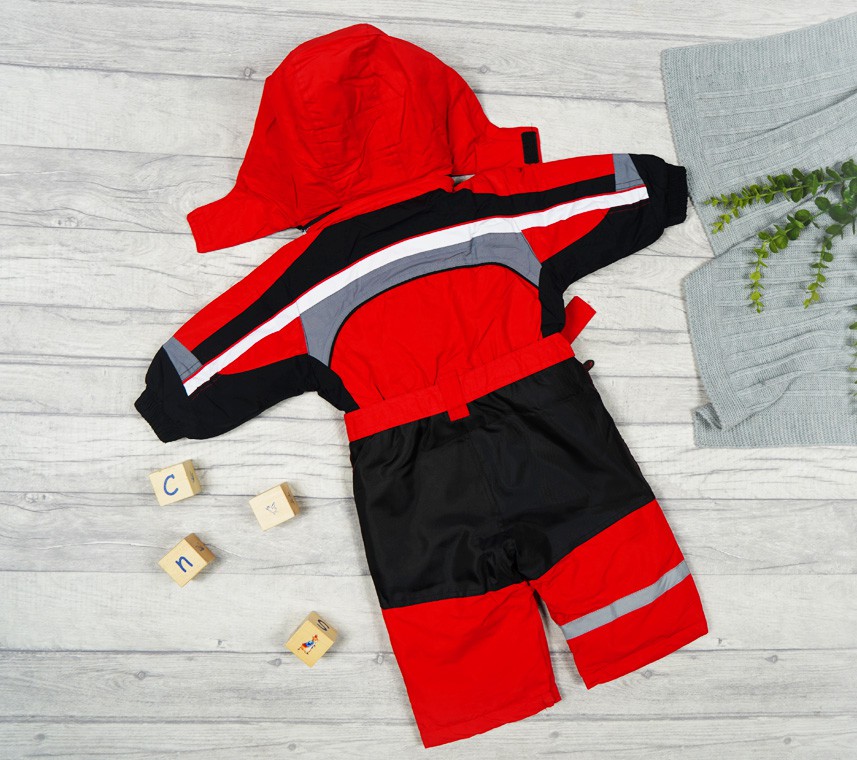 Kombinezon zimowy wykonany jest z warstwy nieprzemakalnej od strony zewnętrznej oraz ocieplony jest od wewnątrz miękkim, czerwonym polarem na kapturze i w miejscu tułowia. Posiada stójkę osłaniającą szyję dziecka, jest zapinany na rzepy oraz suwak. Posiada dwie wbudowane kieszenie na suwak oraz rękawy wykończone ściągaczem podszyte miłym polarem od wewnątrz. Nogawki spodni posiadają dodatkową wewnętrzną nieprzemakalną nogawkę wykończoną ściągaczem dzięki czemu chronią dziecko przed śniegiem i wodą. W miejscu kolan i pupy kombinezon dziecięcy wyposażony jest w specjalny materiał, który lepiej znosi ścieranie i kontakt z wodą.