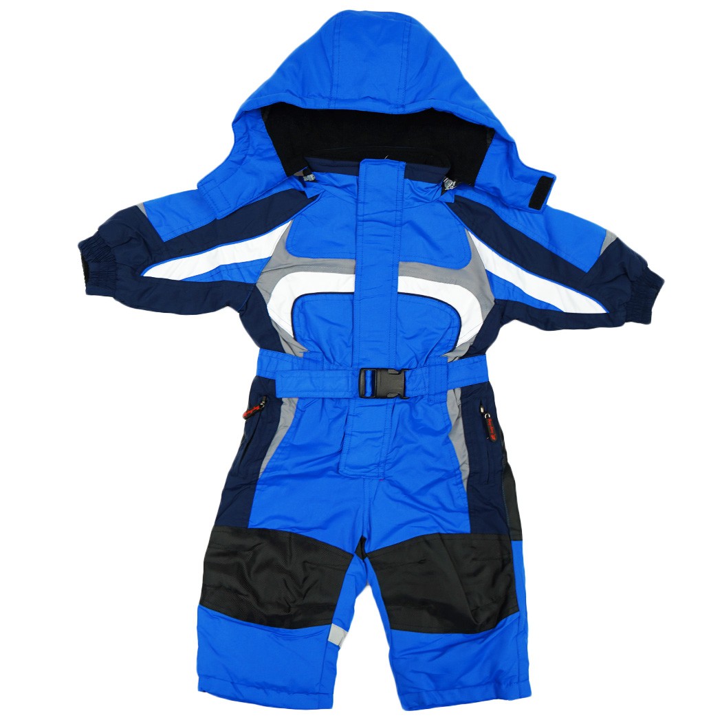 Kombinezon zimowy dla dziecka typu narciarskiego z odpinanym na suwak kapturem i regulowanym paskiem w pasie.