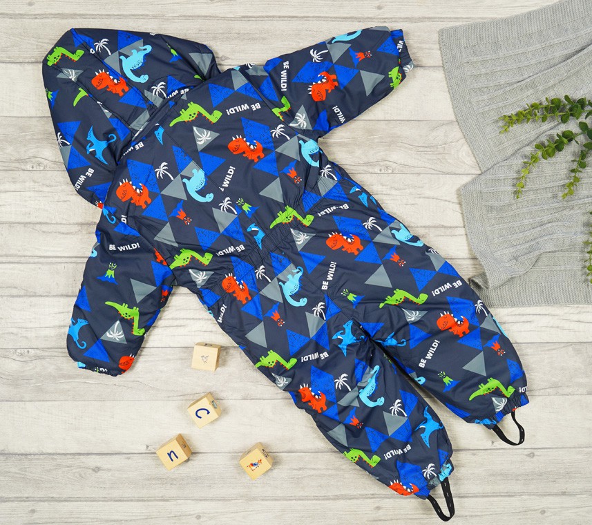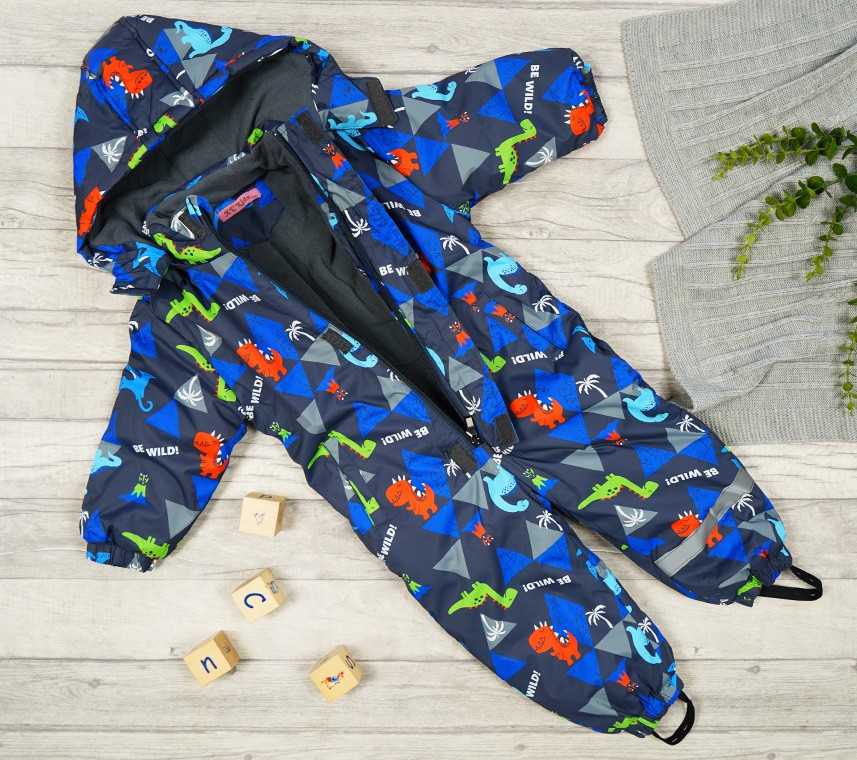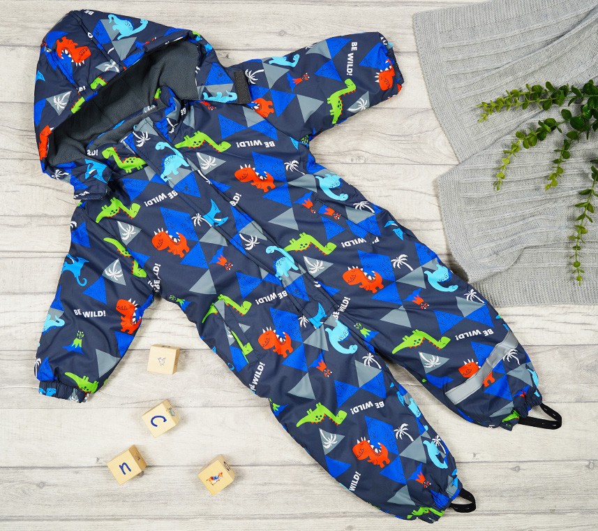 Ten szary, zimowy kombinezon dla chłopca w dinozaury wykonany jest z warstwy nieprzemakalnej od strony zewnętrznej oraz ocieplony jest od wewnątrz miękkim, szarym polarem na kapturze i w miejscu tułowia. Posiada stójkę osłaniającą szyję dziecka, jest zapinany na rzepy oraz suwak. Posiada dwie wbudowane, otwarte kieszenie oraz rękawy i nogawki wykończone ściągaczem. Nogawki spodni posiadają regulowaną guzikiem gumkę zakładaną na stópkę dziecka i trzymającą nogawkę dzięki czemu chronią przed śniegiem i wodą. W tylnej części pasa ten kombinezon dziecięcy wyposażony jest w wygodną, wszytą gumkę dopasowaną do talii dziecka.