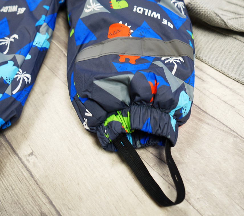 Zimowy kombinezon szary w dinozaury, trójkąty, wulkany oraz napisy posiada odblaskowy pas na nogawce dzięki któremu dziecko widoczne jest podczas zabawy na śniegu i stoku narciarskim.