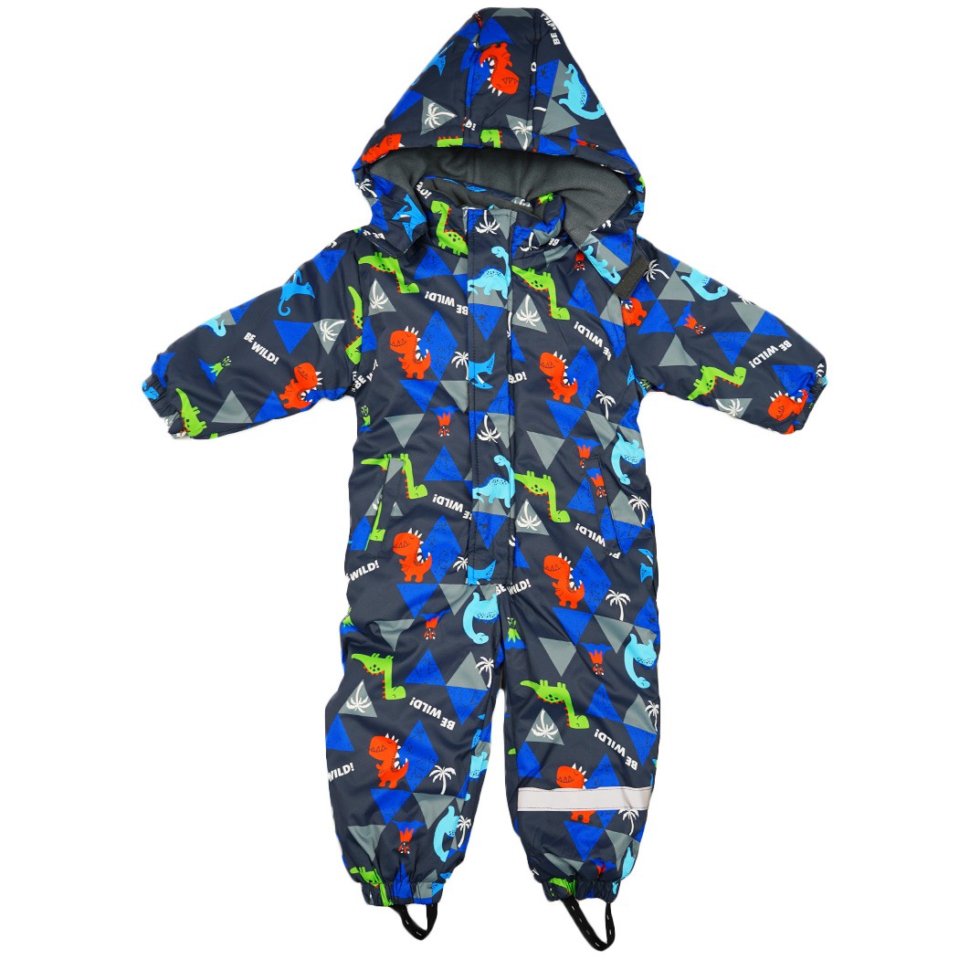 Zimowy kombinezon chłopięcy w dinozaury to kombinezon typu narciarskiego z odpinanym na suwak kapturem.