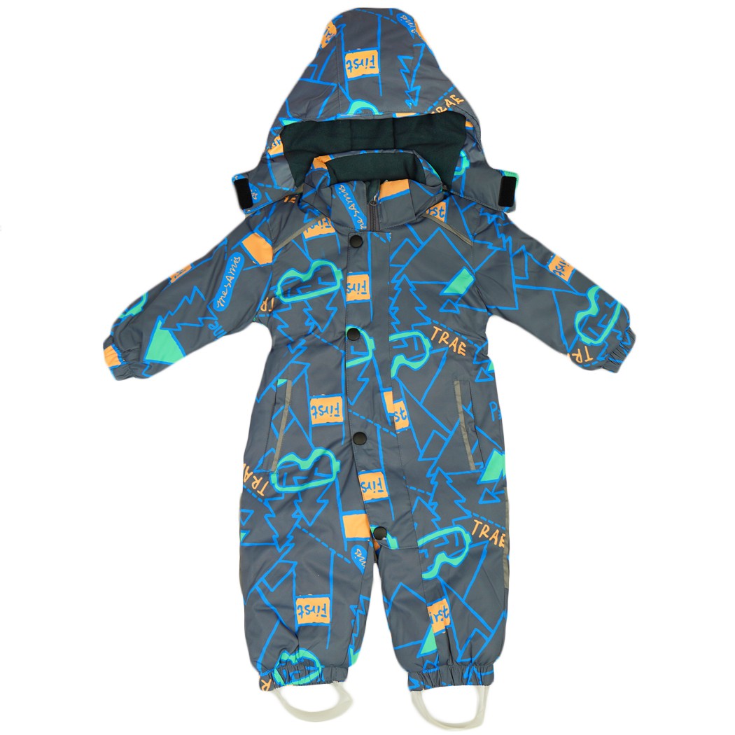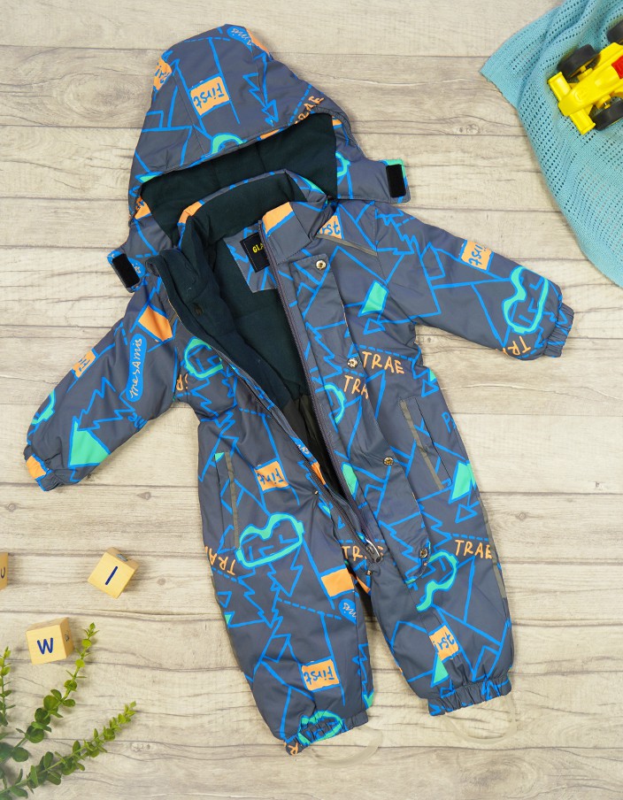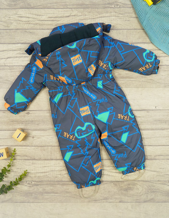 Kombinezon zimowy wykonany jest z warstwy nieprzemakalnej od strony zewnętrznej oraz ocieplony jest od wewnątrz miękkim polarem na kapturze i w miejscu tułowia. Posiada stójkę osłaniającą szyję dziecka, jest zapinany na rzepy oraz suwak. Posiada dwie wbudowane, otwarte kieszenie oraz rękawy i nogawki wykończone ściągaczem. Nogawki spodni posiadają regulowaną guzikiem sylikonową gumkę zakładaną na stópkę dziecka i trzymającą nogawkę dzięki czemu chronią przed śniegiem i wodą. W tylnej części pasa kombinezon dziecięcy wyposażony jest w wygodną, wszytą gumkę dopasowaną do talii dziecka.