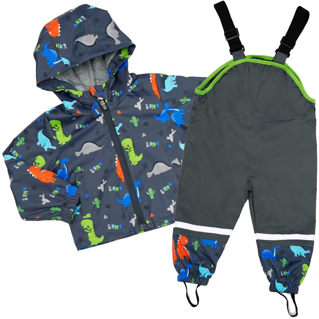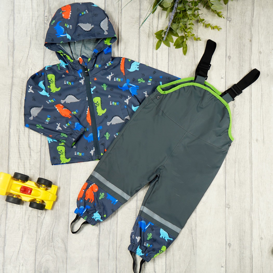 Kombinezon przeciwdeszczowy dla dziecka, w skład którego wchodzą: zapinana na suwak grafitowa kurtka w dinozaury oraz grafitowe spodnie na szelki.