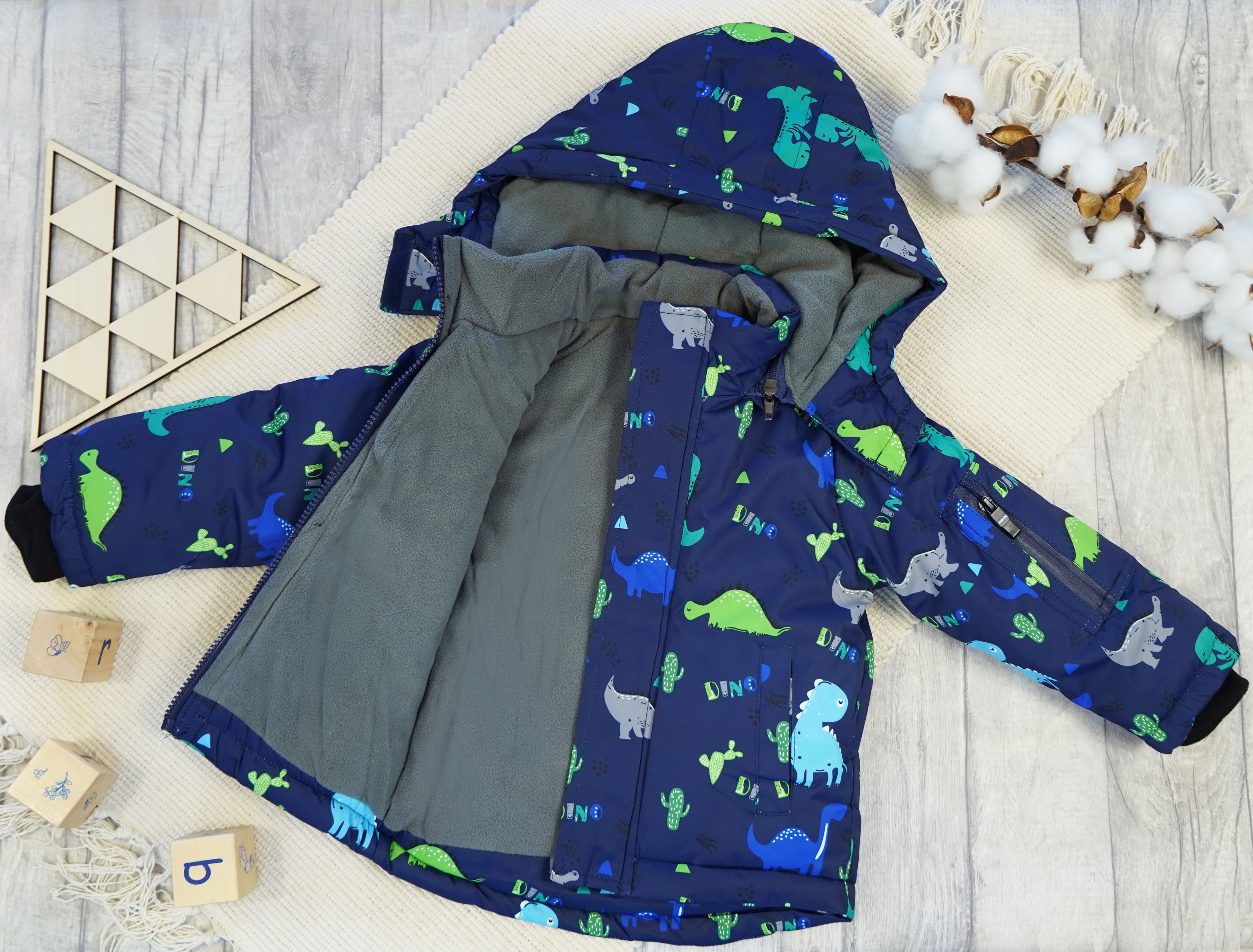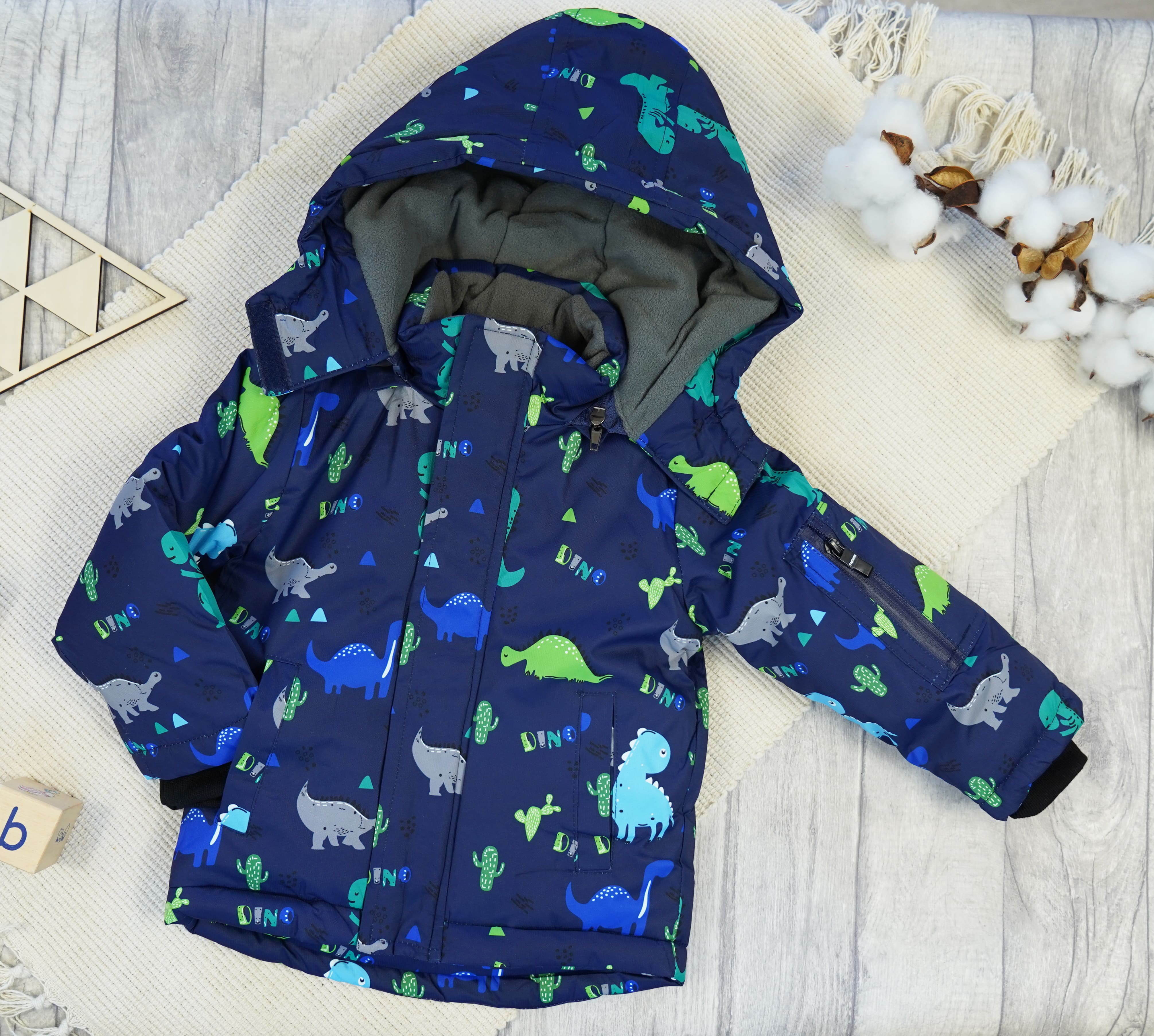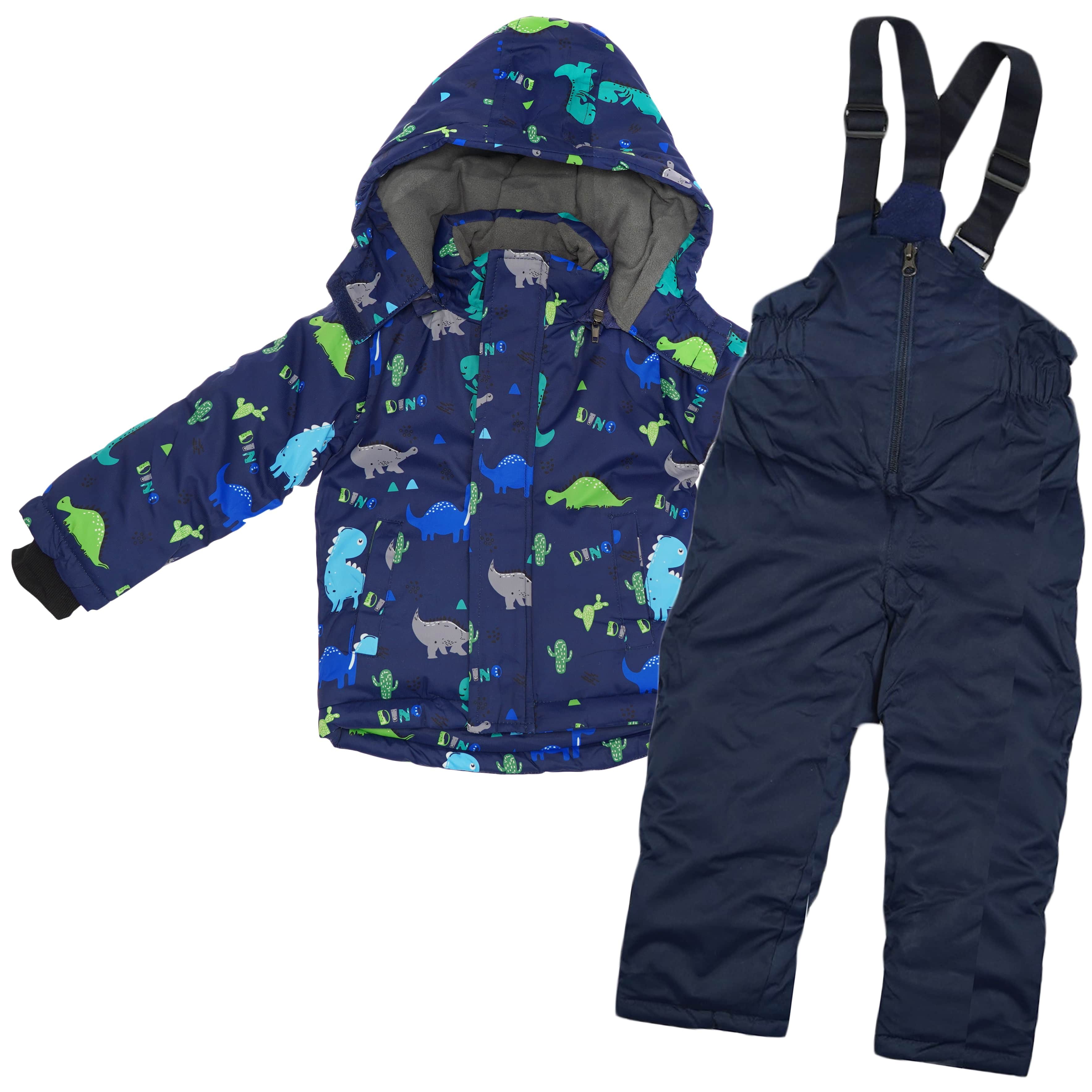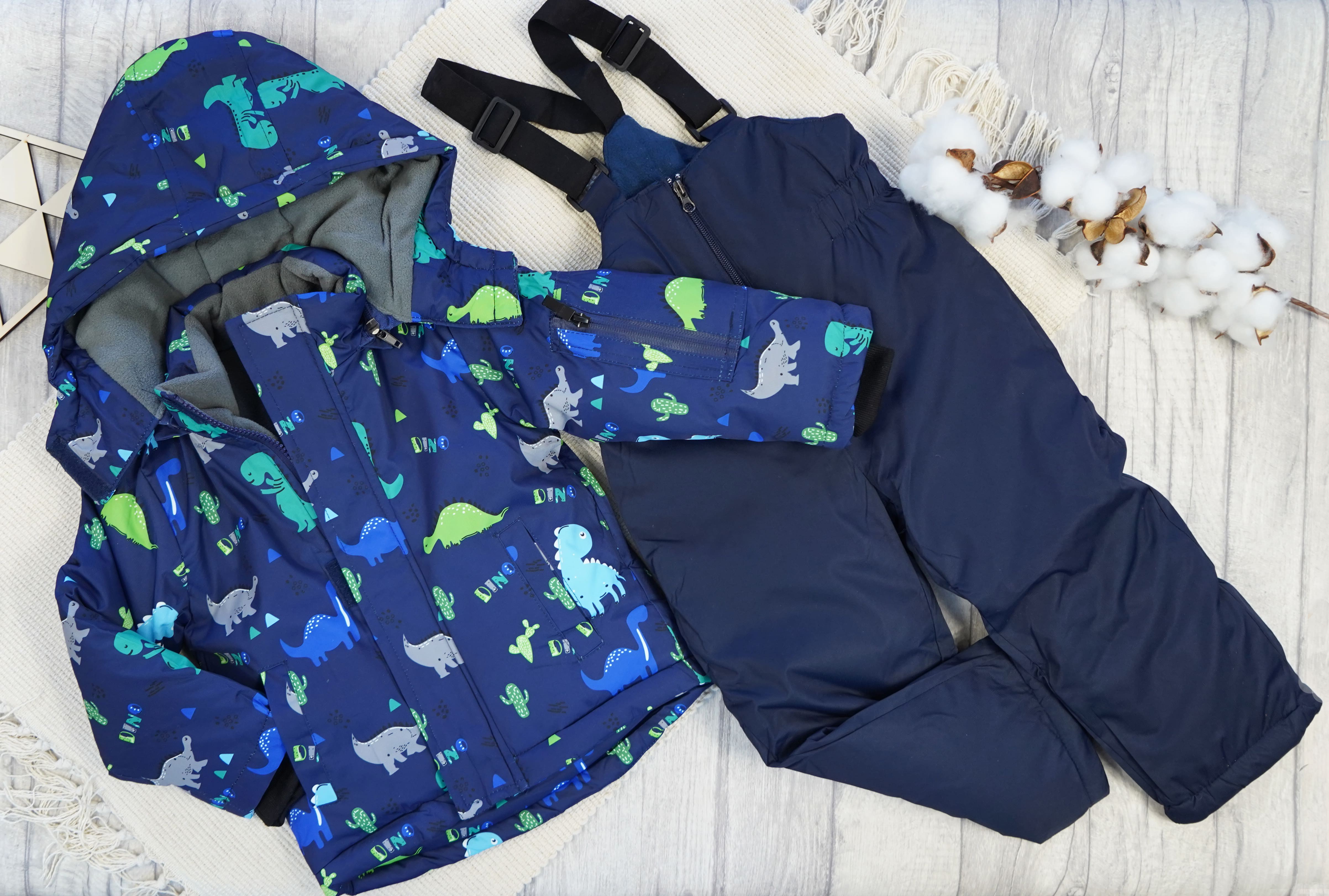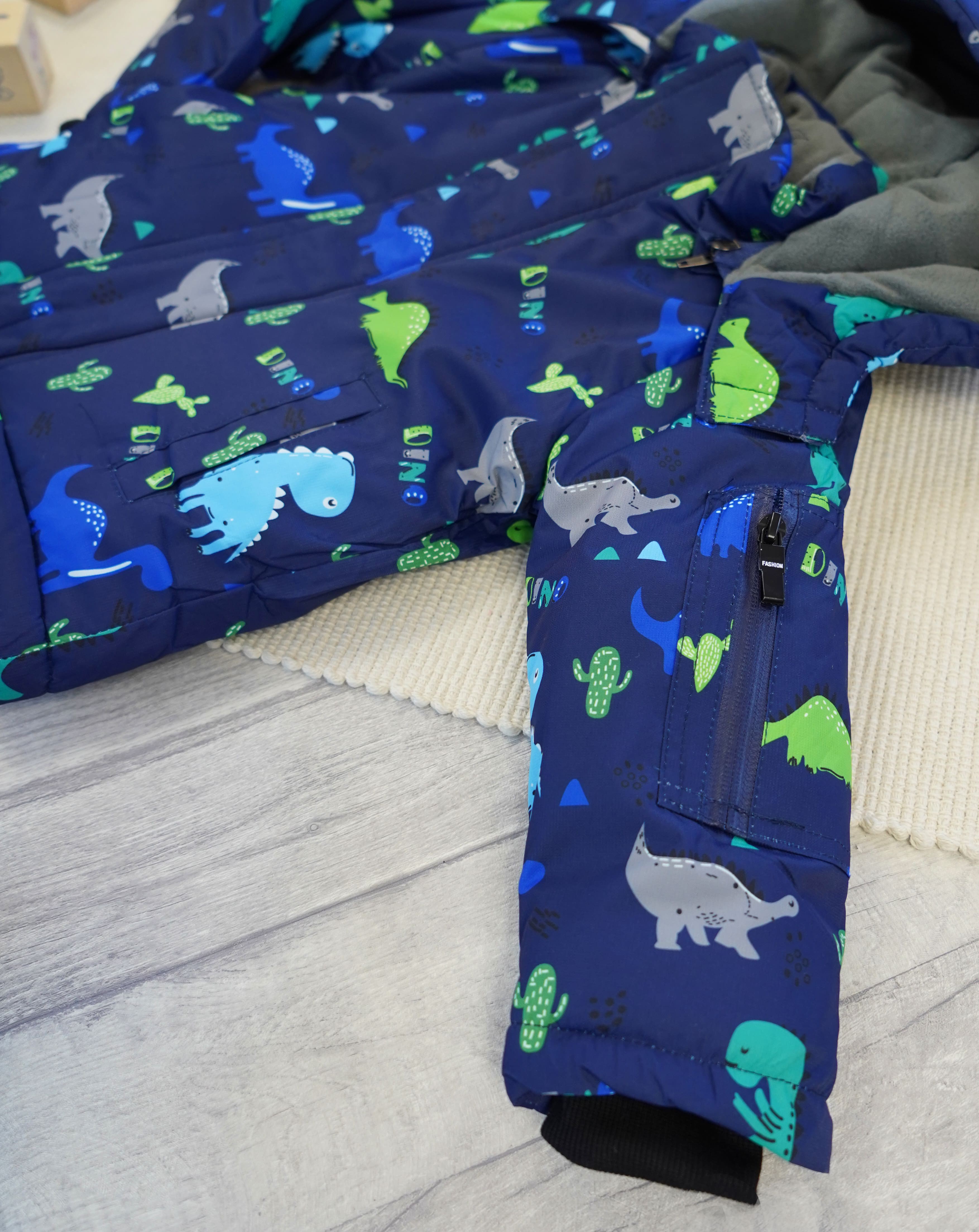 Kombinezon zimowy dla dziecka, w skład którego wchodzą: zapinana na suwak i rzepy ciepła, granatowa kurtka zimowa w dinozaury oraz granatowe spodnie typu narciarskiego.