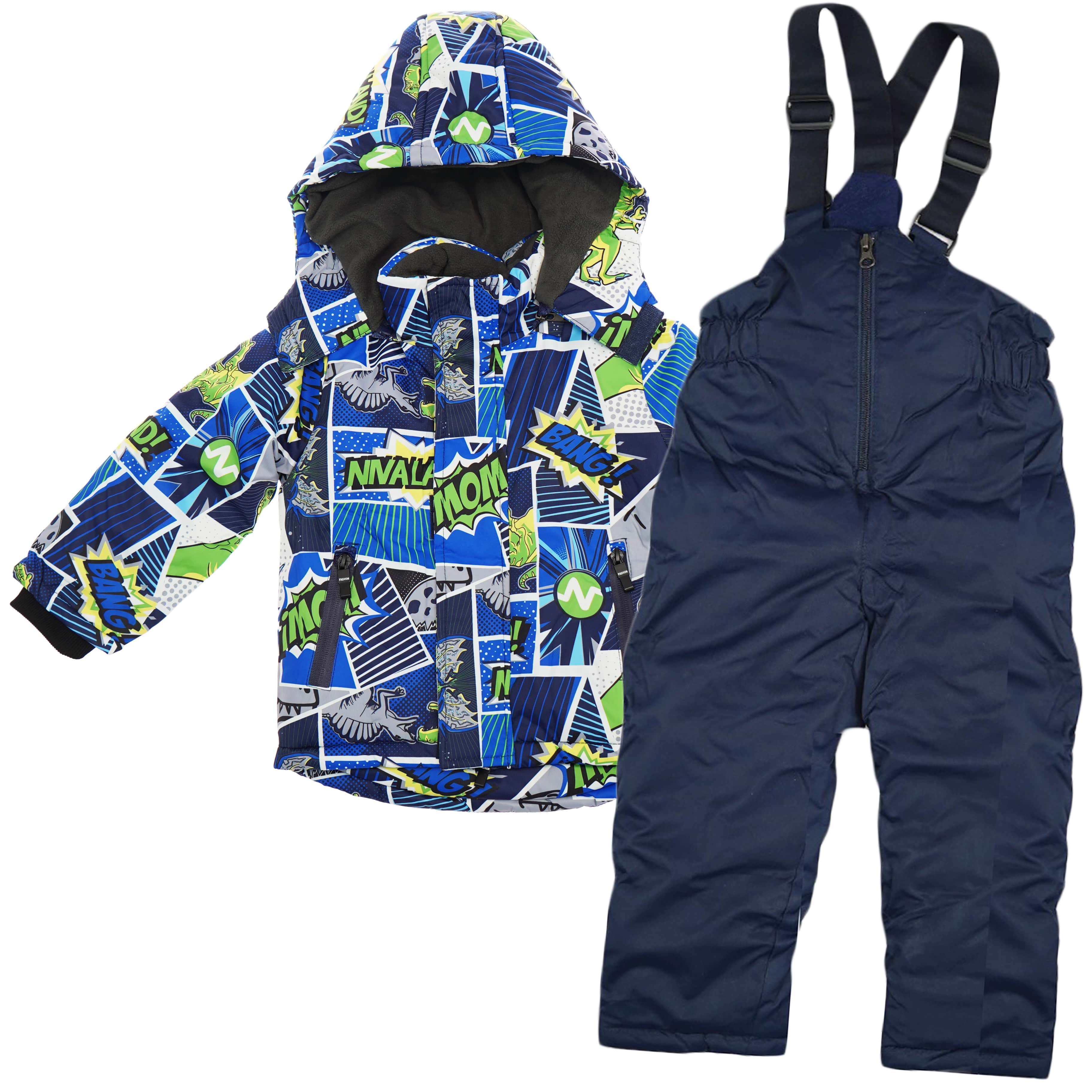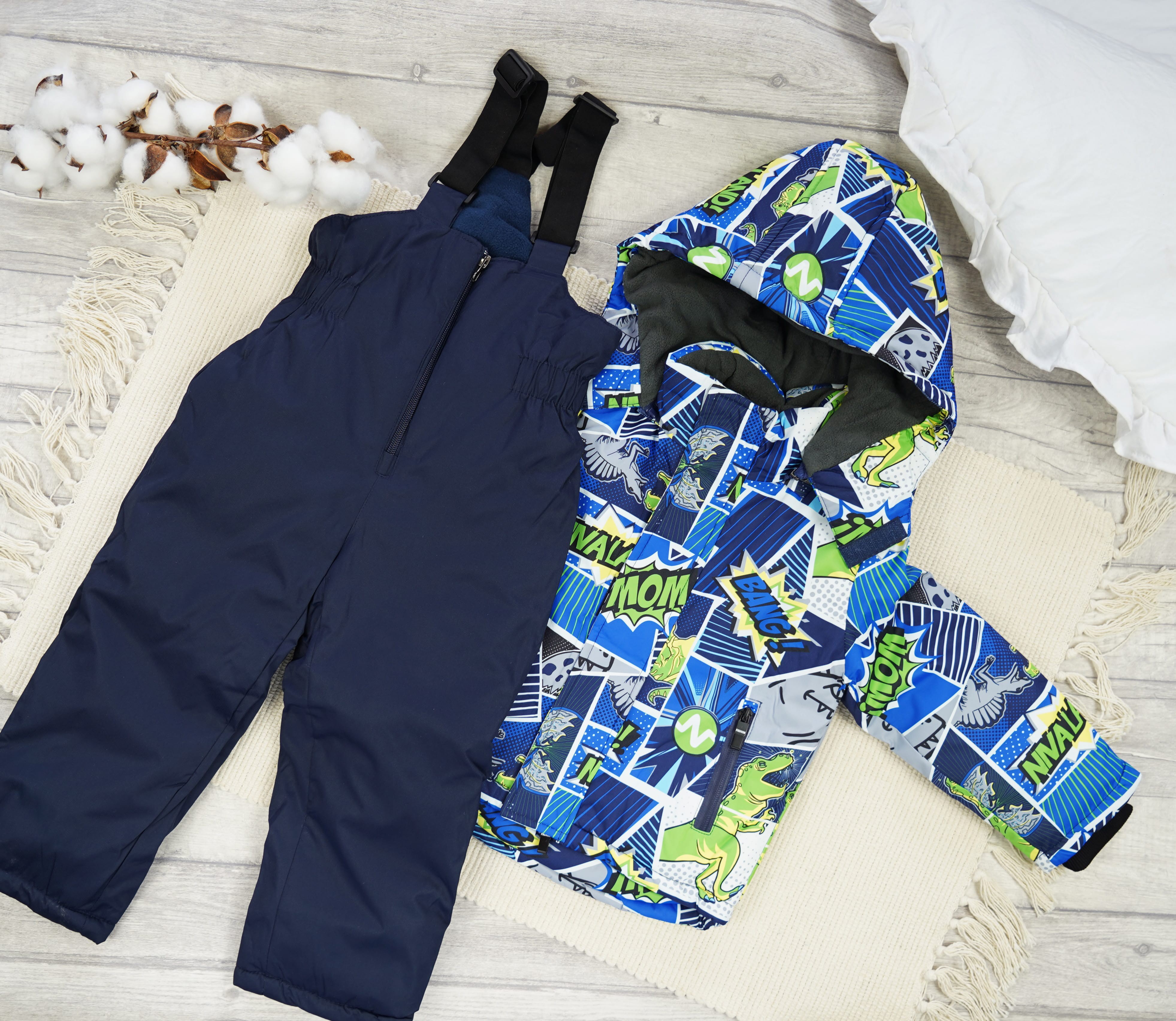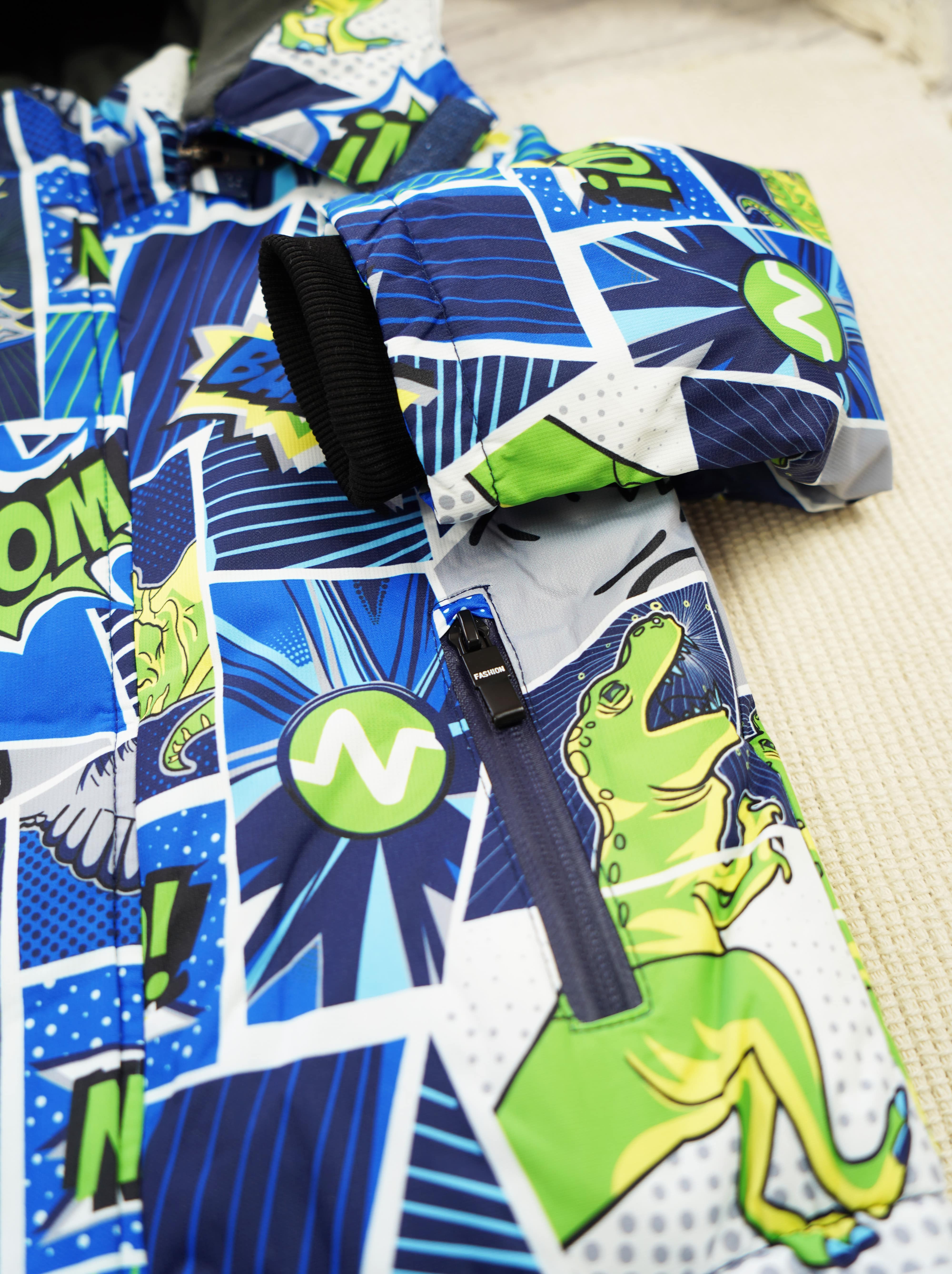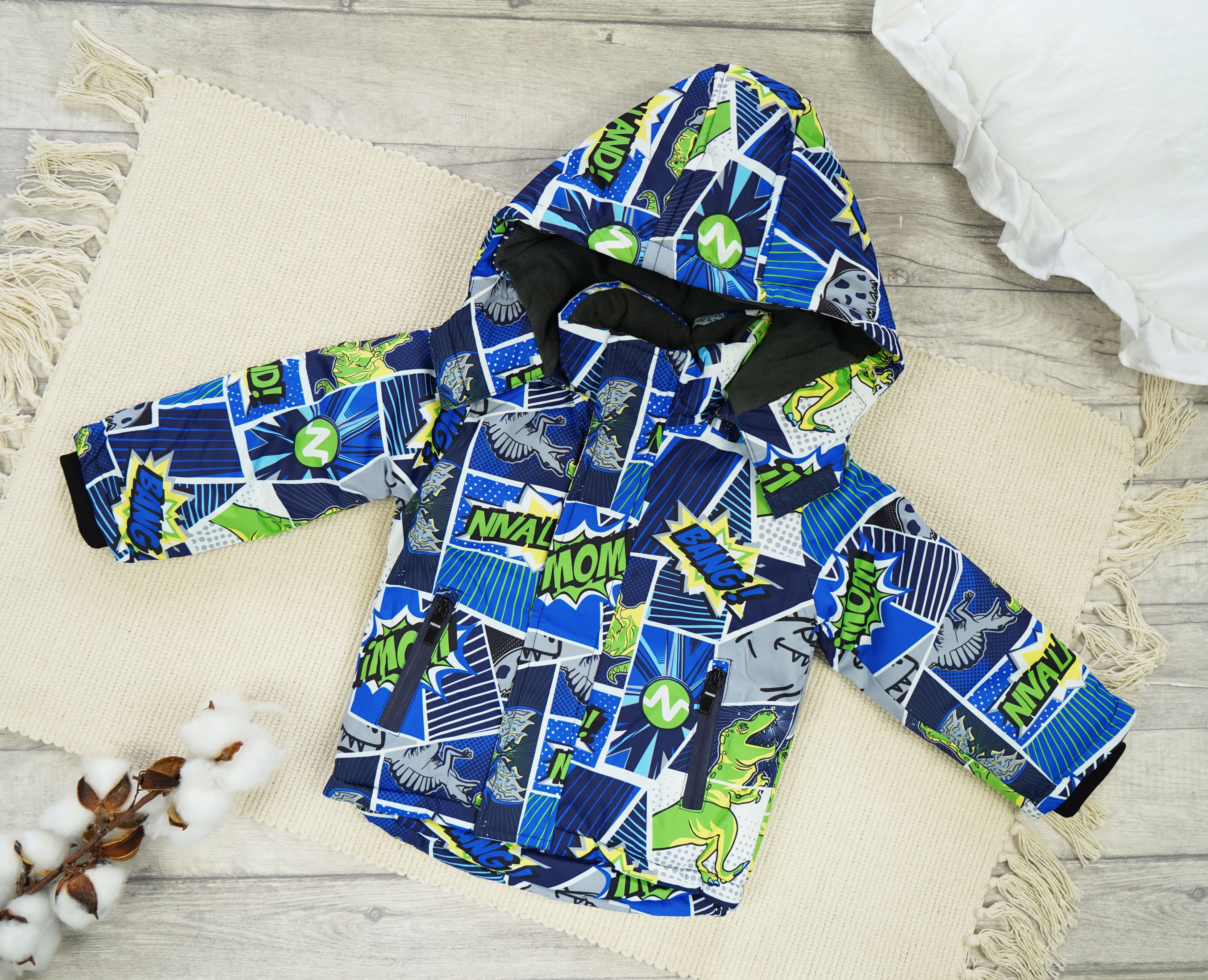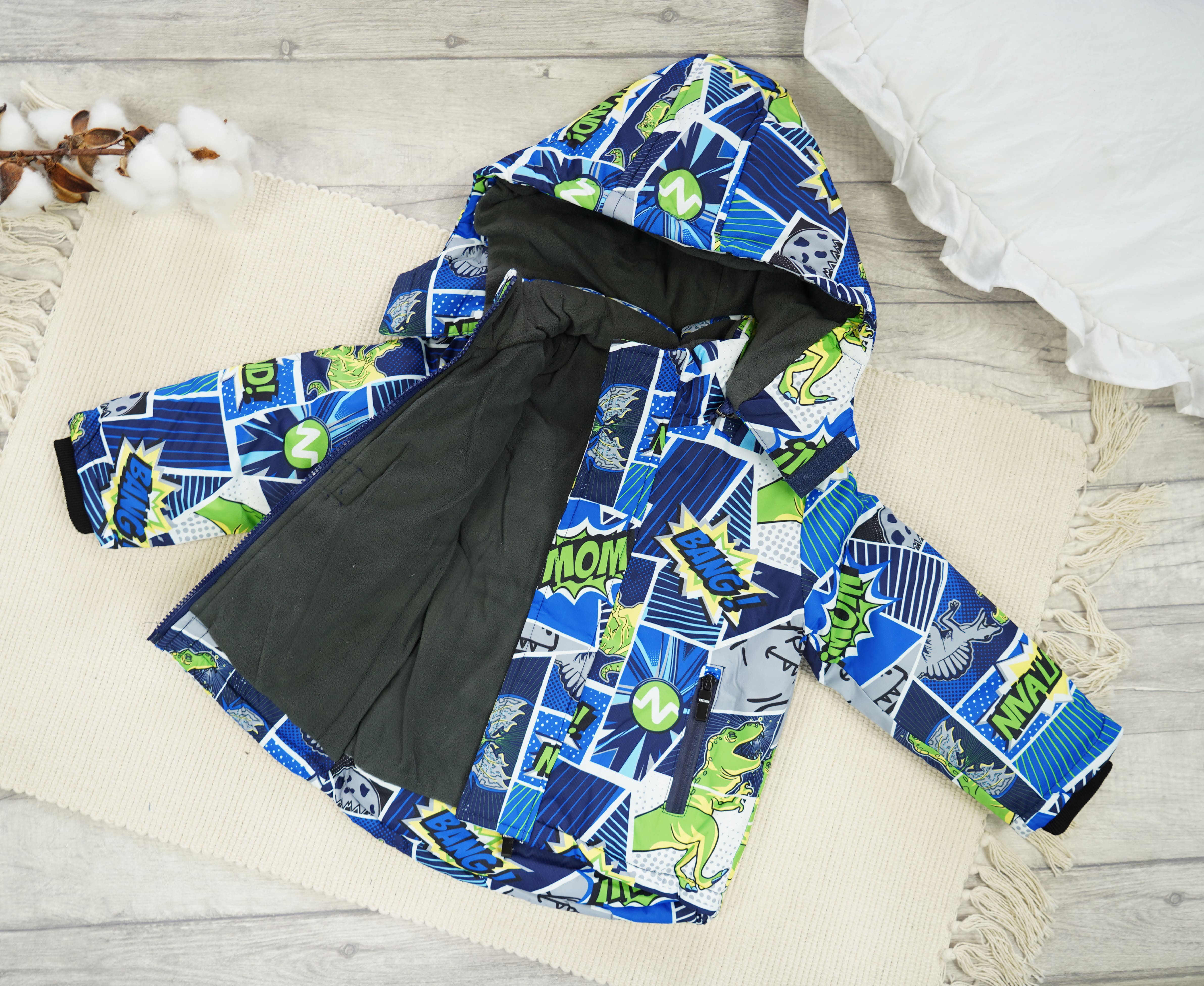 ZIMOWY KOMBINEZON dwuczęściowy dinozaury komiks kurtka z niebieskim i granatowe spodnie
