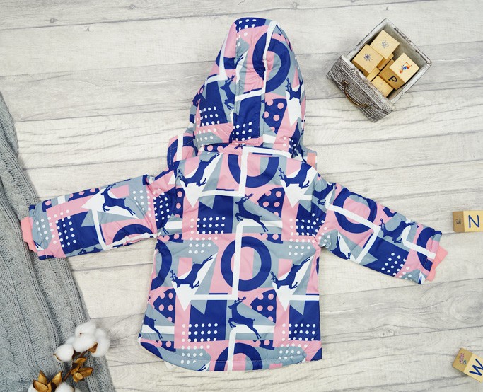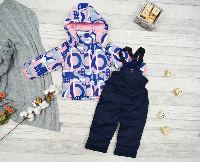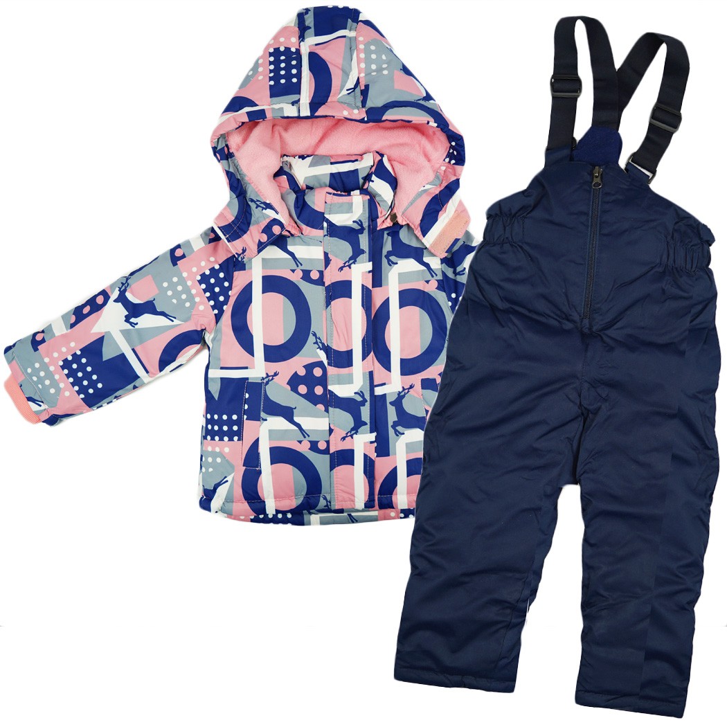 Kombinezon zimowy dla dziecka, w skład którego wchodzą: zapinana na suwak i rzepy ciepła, granatowo-różowa kurtka zimowa w jelonki oraz granatowe spodnie typu narciarskiego.