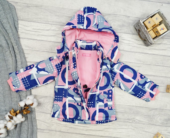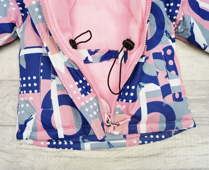 Dostępna w zestawie kurtka zimowa wykonana z warstwy nieprzemakalnej od strony zewnętrznej oraz ocieplona od wewnątrz miękkim polarem. Posiada ona stójkę osłaniającą szyję dziecka oraz odsuwany kaptur wyposażony w zapięcie na rzep. Kaptur kurtki również został ocieplony polarem. Kurtka zawiera dwie wbudowane kieszenie oraz ściągacz w pasie. Rękawy wykończone doszytym wewnątrz ściągaczem.