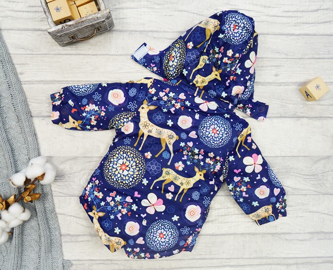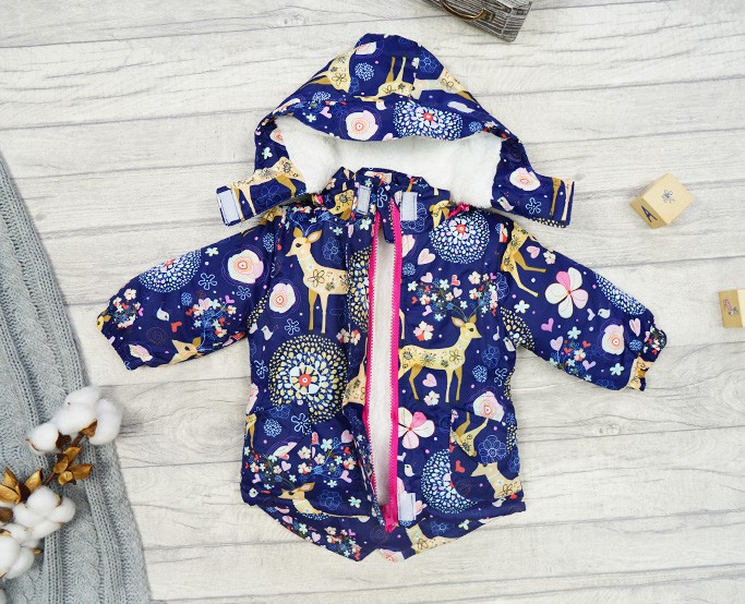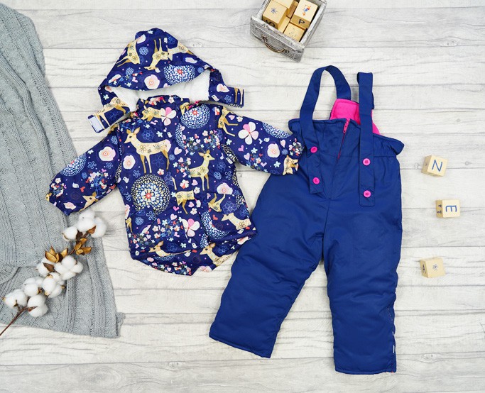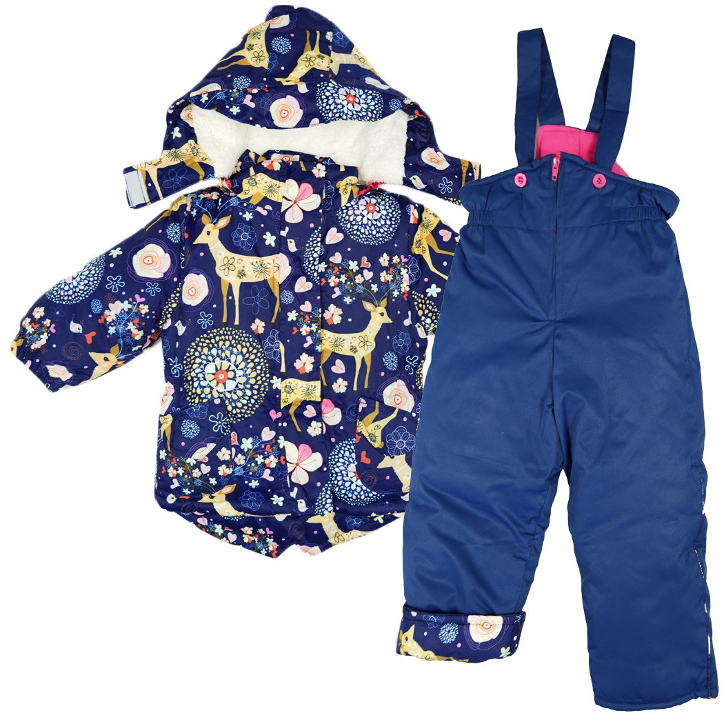 Kombinezon zimowy dla dziecka, w skład którego wchodzą: zapinana na suwak i rzepy ciepła, granatowa kurtka zimowa w sarenki i kwiaty oraz granatowe spodnie typu narciarskiego.