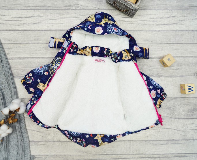 Dostępna w zestawie kurtka zimowa wykonana z warstwy nieprzemakalnej od strony zewnętrznej oraz ocieplona od wewnątrz miękkim polarem. Posiada ona stójkę osłaniającą szyję dziecka oraz odsuwany kaptur wyposażony w zapięcie na rzep. Kaptur kurtki również został ocieplony polarem. Kurtka zawiera dwie wbudowane kieszenie oraz rękawy wykończone gumką.