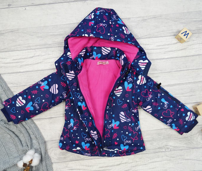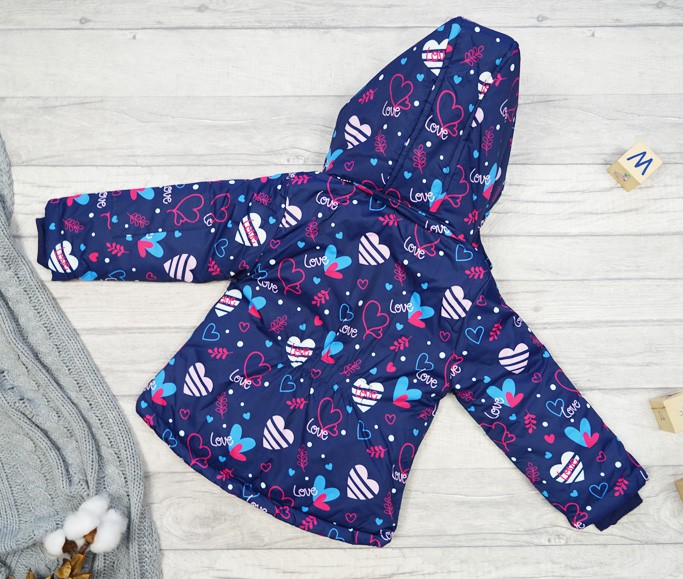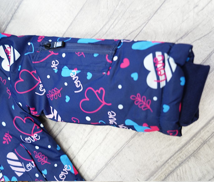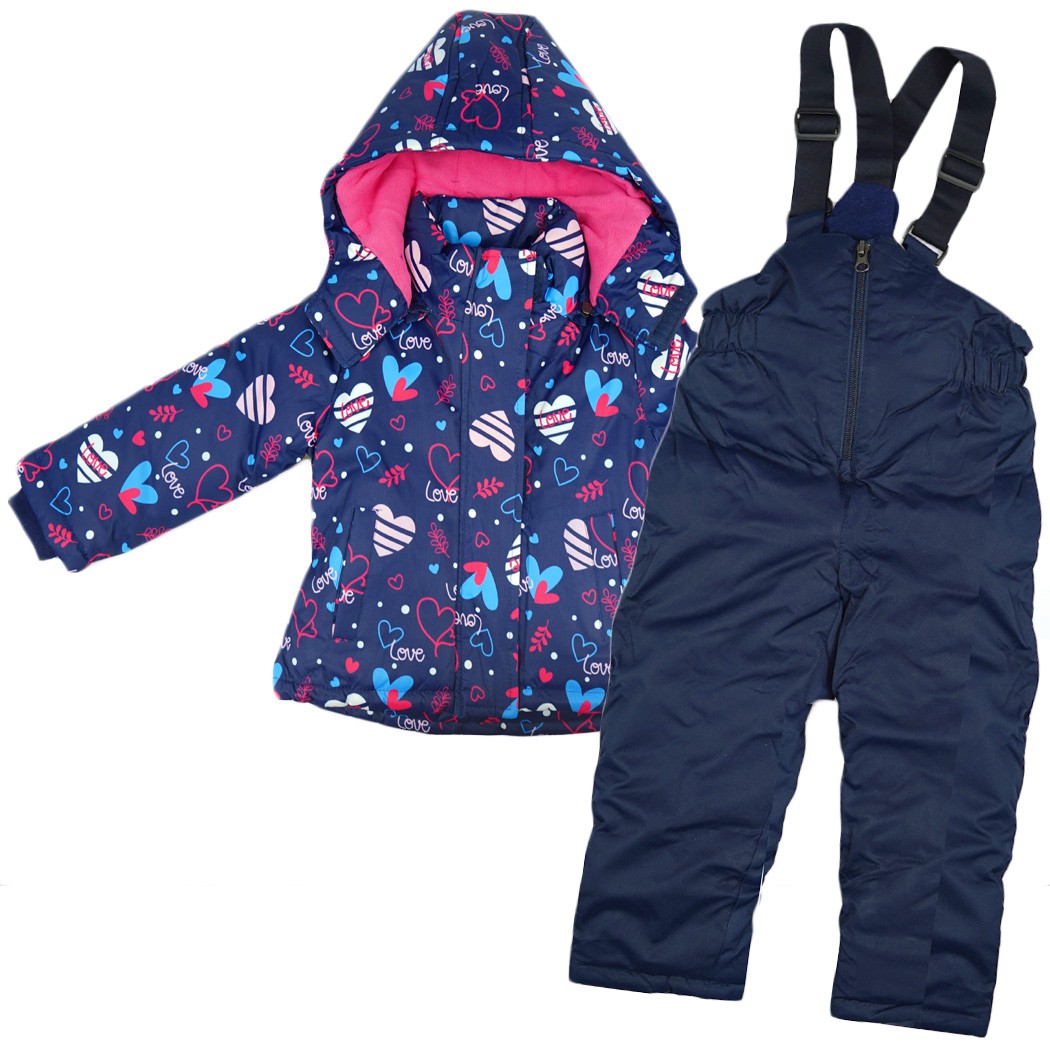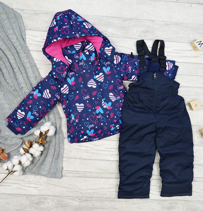 Kombinezon zimowy dla dziecka, w skład którego wchodzą: zapinana na suwak i rzepy ciepła, granatowa kurtka zimowa w serca i napisy "LOVE" oraz granatowe spodnie typu narciarskiego.