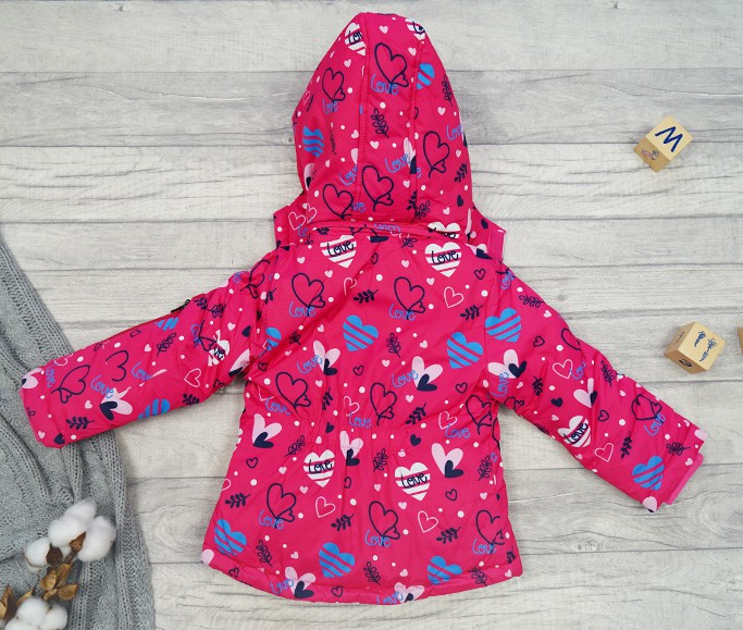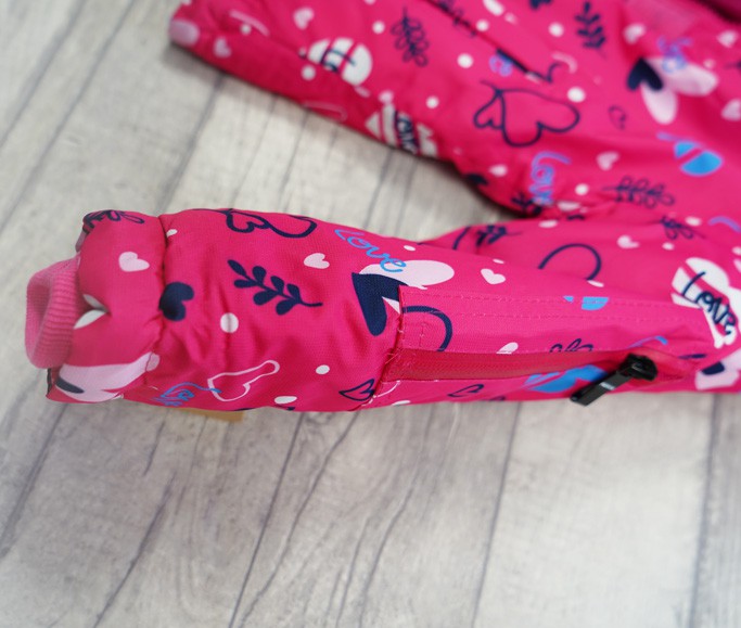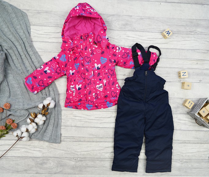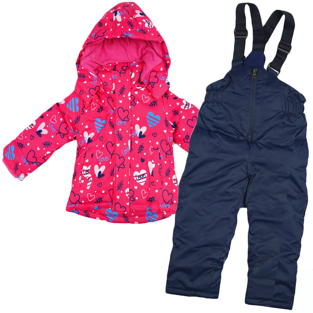 Kombinezon zimowy dla dziecka, w skład którego wchodzą: zapinana na suwak i rzepy ciepła, różowa kurtka zimowa w serca i napisy "LOVE" oraz granatowe spodnie typu narciarskiego.