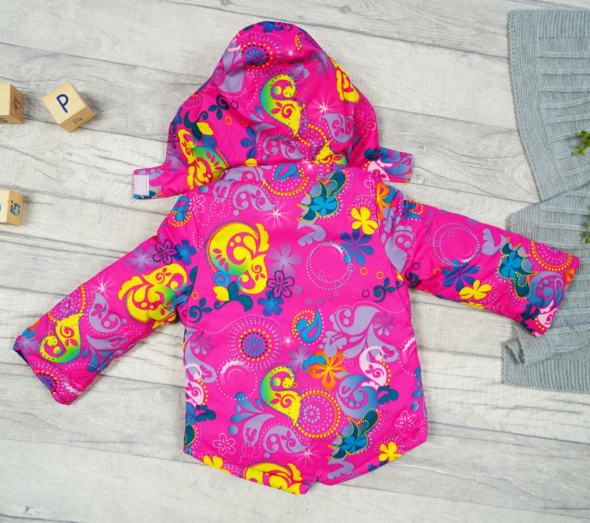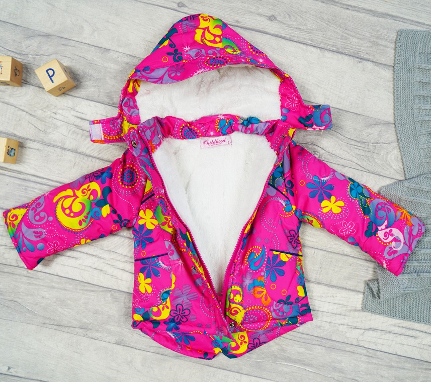 Dostępna w zestawie kurtka zimowa wykonana z warstwy nieprzemakalnej od strony zewnętrznej oraz ocieplona od wewnątrz miękkim polarem. Posiada ona stójkę osłaniającą szyję dziecka oraz odsuwany kaptur wyposażony w zapięcie na rzep. Kaptur kurtki również został ocieplony polarem. Kurtka zawiera dwie wbudowane kieszenie oraz rękawy wykończone gumką.
