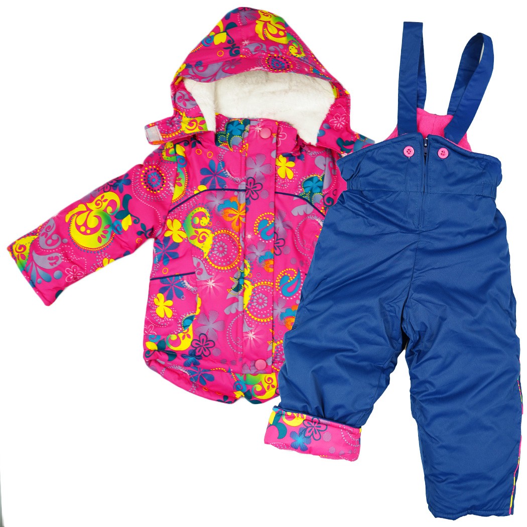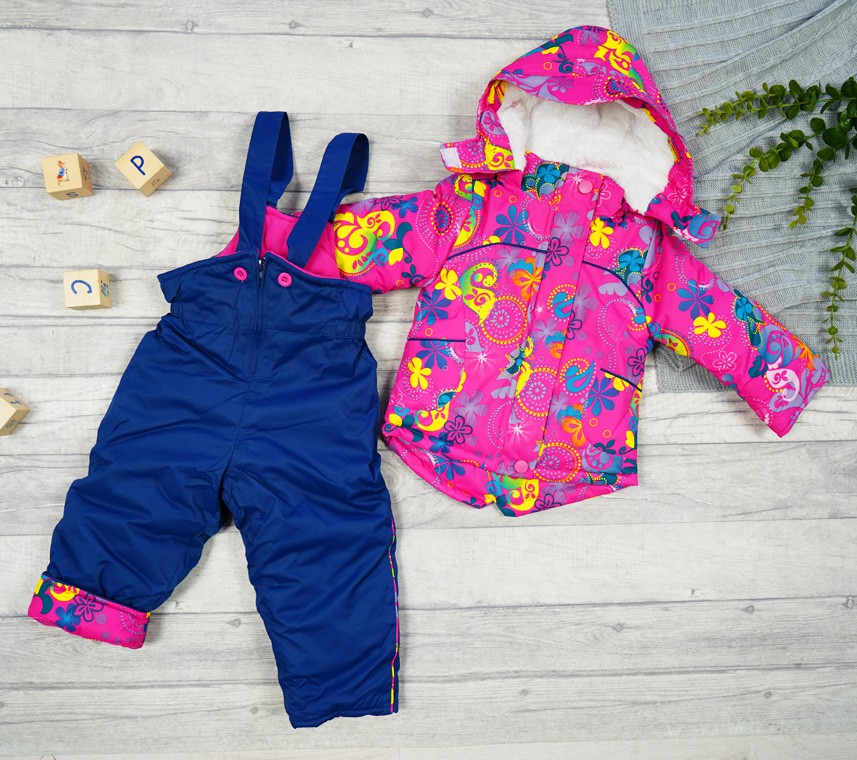Kombinezon zimowy dla dziecka, w skład którego wchodzą: zapinana na suwak i rzepy ciepła, różowa kurtka zimowa w kolorowe kwiaty oraz granatowe spodnie typu narciarskiego.