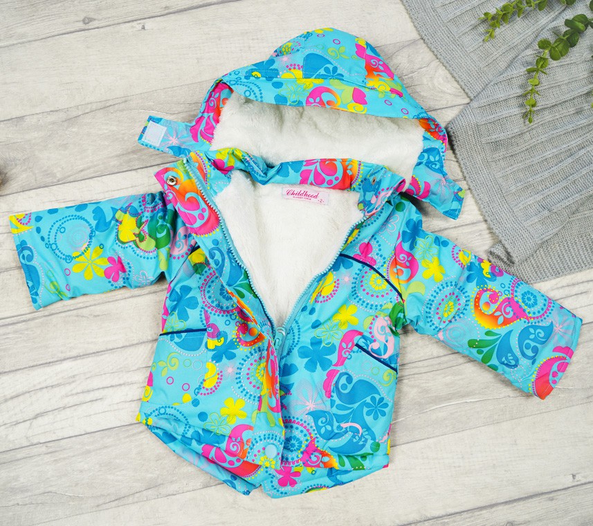 Dostępna w zestawie kurtka zimowa wykonana z warstwy nieprzemakalnej od strony zewnętrznej oraz ocieplona od wewnątrz miękkim polarem. Posiada ona stójkę osłaniającą szyję dziecka oraz odsuwany kaptur wyposażony w zapięcie na rzep. Kaptur kurtki również został ocieplony polarem. Kurtka zawiera dwie wbudowane kieszenie oraz rękawy wykończone gumką.