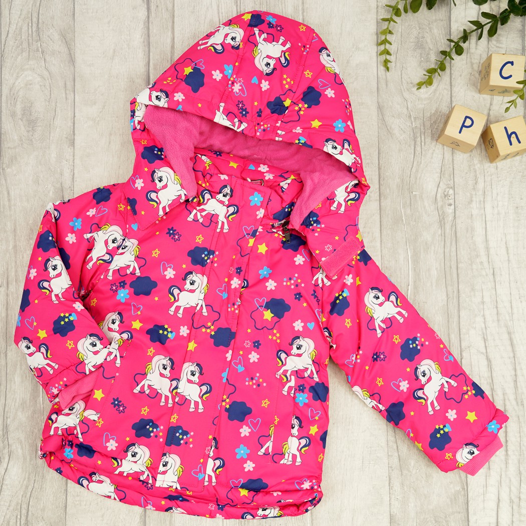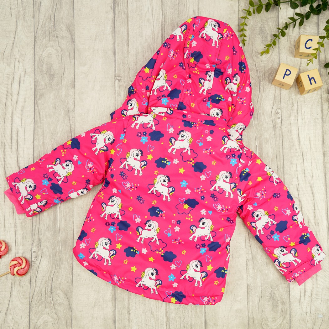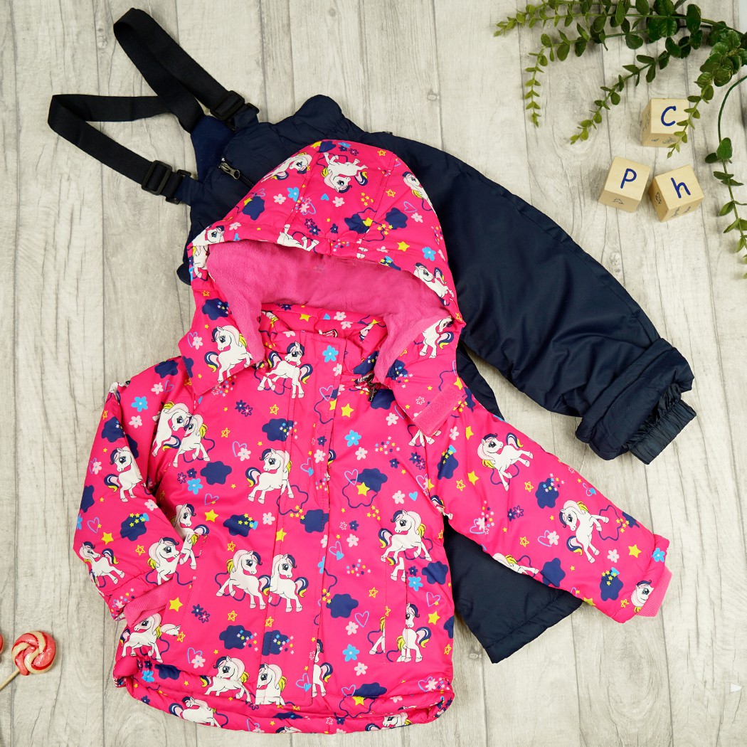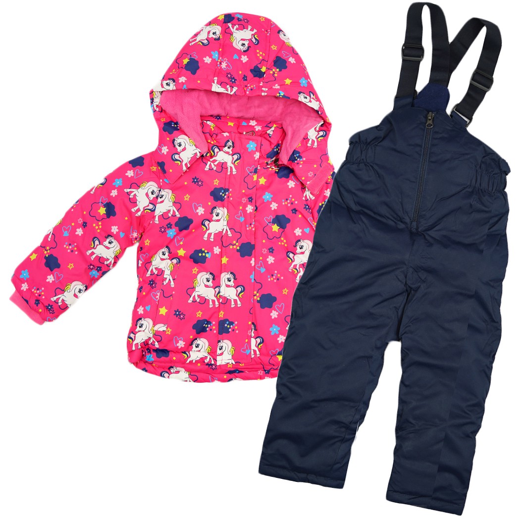 Kombinezon zimowy dla dziecka, w skład którego wchodzą: zapinana na suwak i rzepy ciepła, różowa kurtka zimowa w jednorożce oraz granatowe spodnie typu narciarskiego.