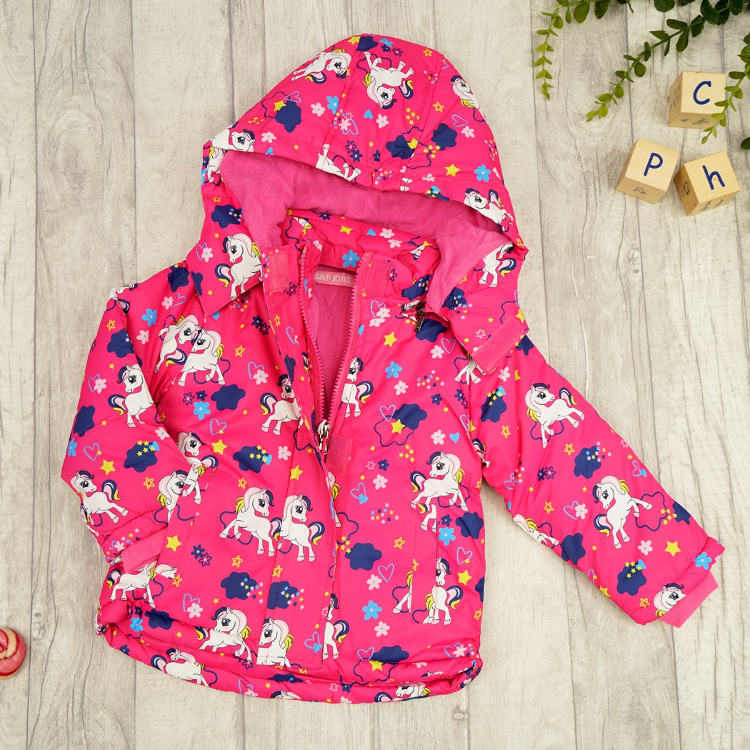 Dostępna w zestawie kurtka zimowa wykonana z warstwy nieprzemakalnej od strony zewnętrznej oraz ocieplona od wewnątrz miękkim polarem. Posiada ona stójkę osłaniającą szyję dziecka oraz odsuwany kaptur wyposażony w zapięcie na rzep. Kaptur kurtki również został ocieplony polarem. Kurtka zawiera dwie wbudowane kieszenie oraz wewnętrzny ściągacz w pasie. Rękawy wykończone doszytym wewnątrz ściągaczem.