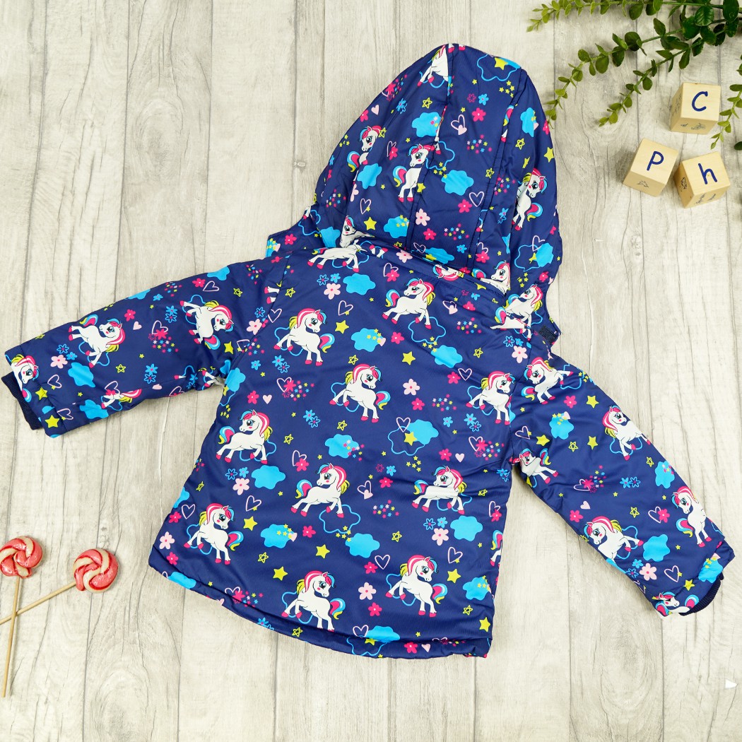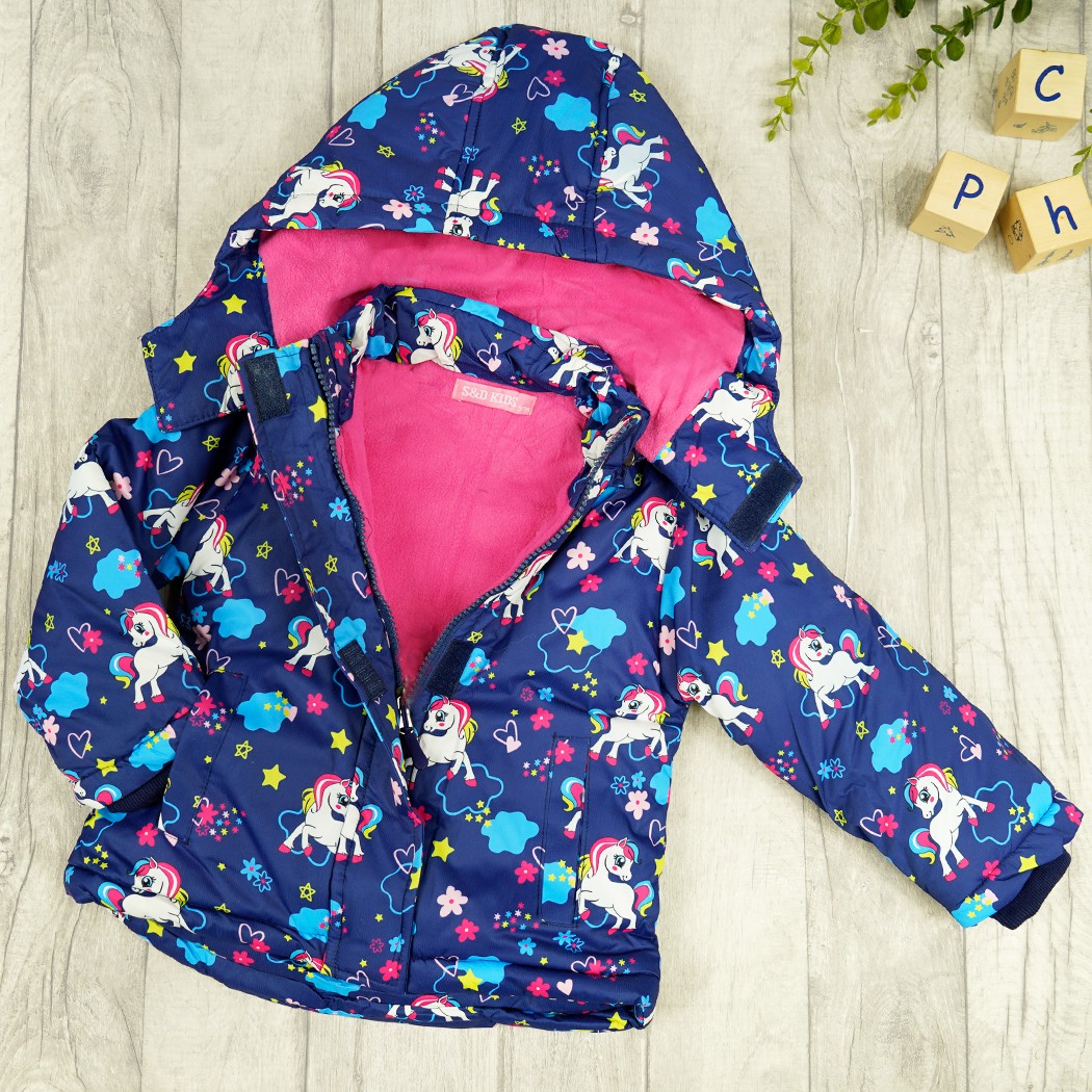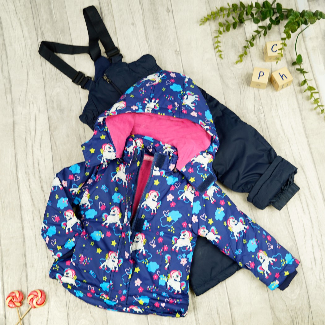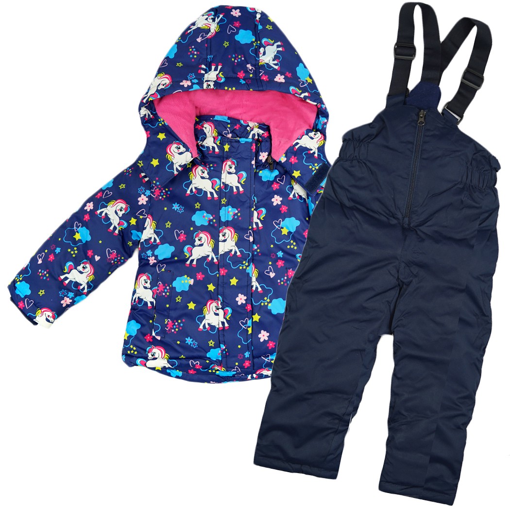 Kombinezon zimowy dla dziecka, w skład którego wchodzą: zapinana na suwak i rzepy ciepła, granatowa kurtka zimowa w jednorożce oraz granatowe spodnie typu narciarskiego.