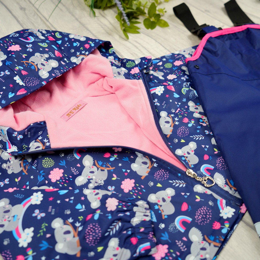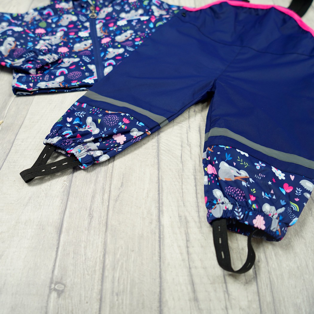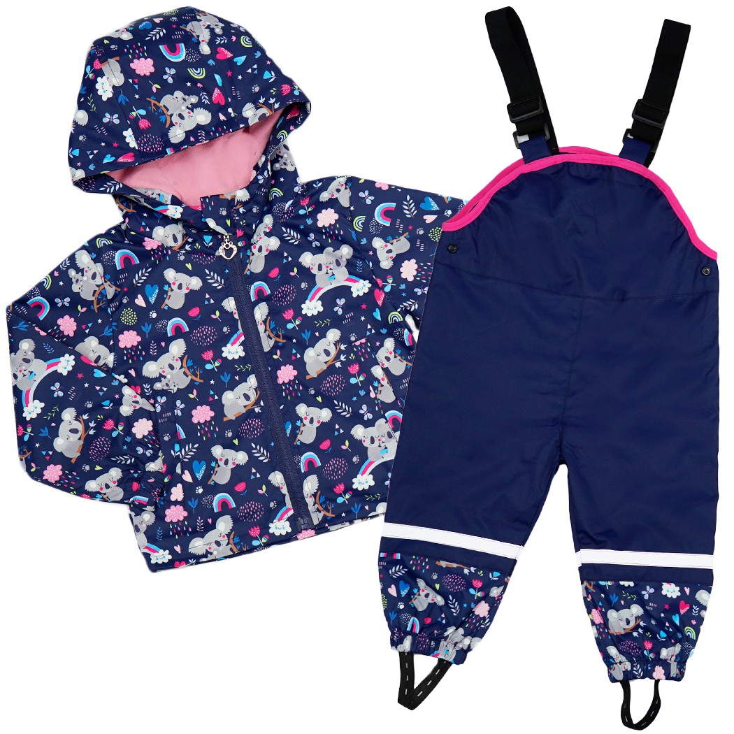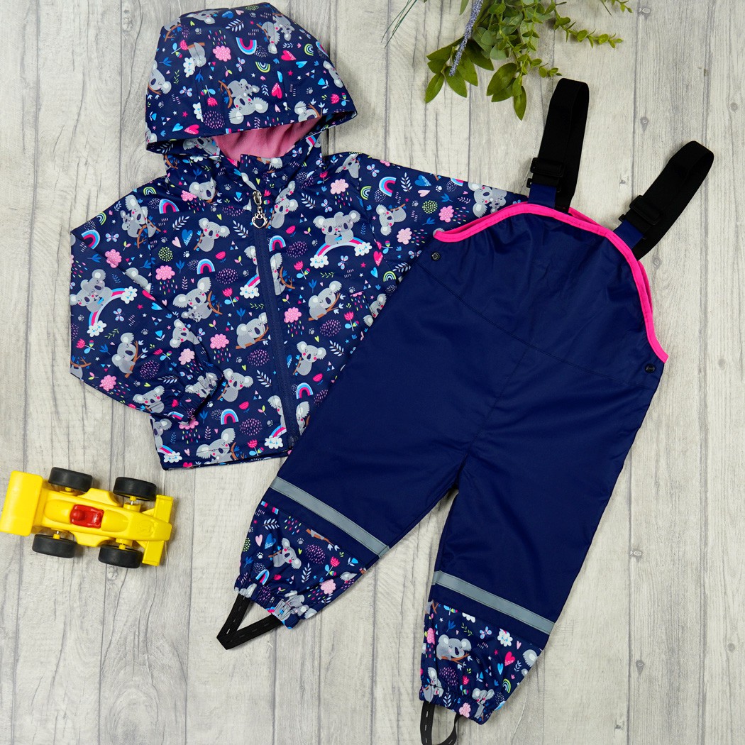 Kombinezon przeciwdeszczowy dla dziecka, w skład którego wchodzą: zapinana na suwak granatowa kurtka w misie koala oraz granatowe spodnie na szelki.