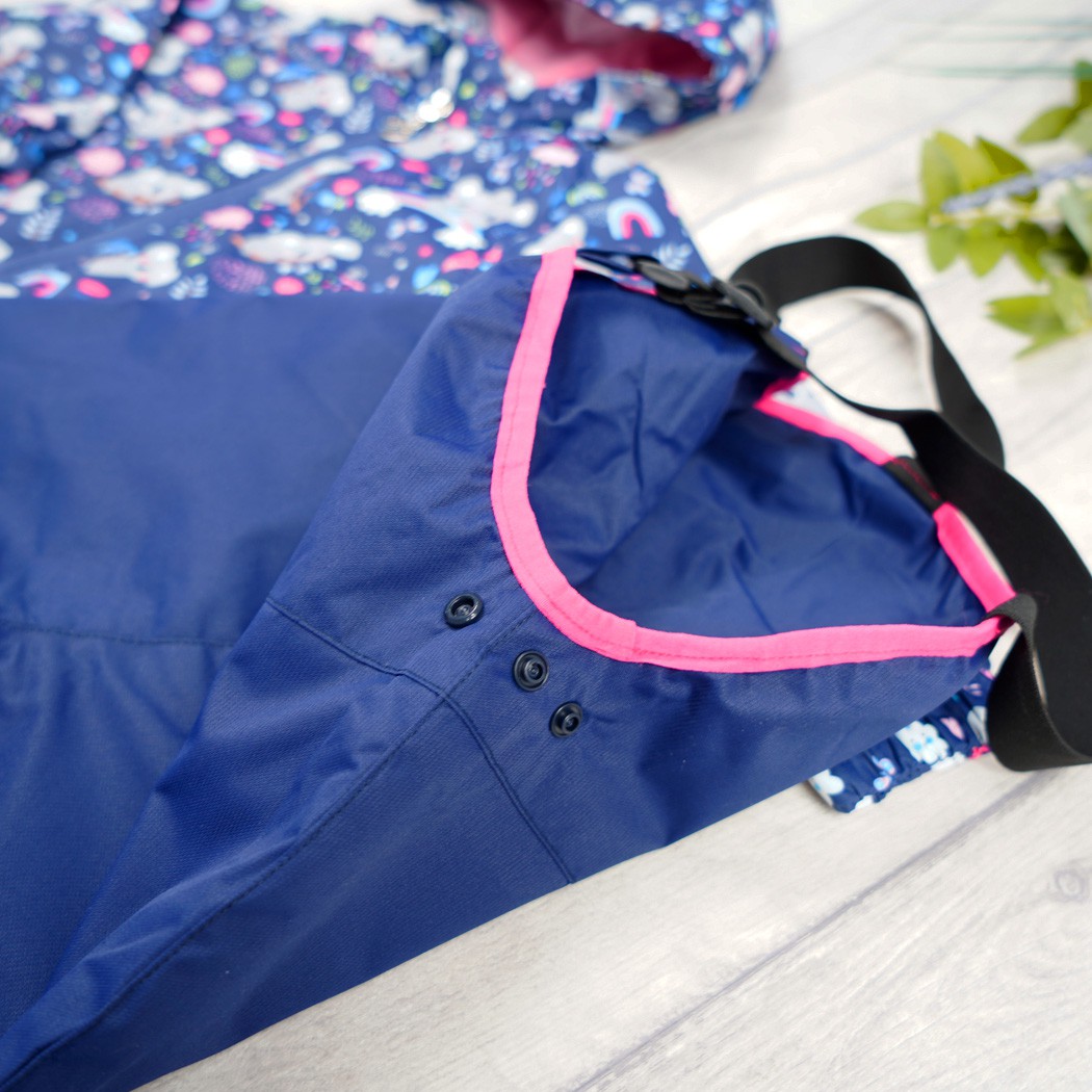 W skład kompletu wchodzą również spodnie z wysokim stanem i elementami odblaskowymi. Wewnętrzna strona spodni wykończona cienką warstwą przyjemnego w dotyku polaru, regulacja w pasie na zatrzaski, praktyczne ściągacze przy nogawkach oraz regulowane szelki.