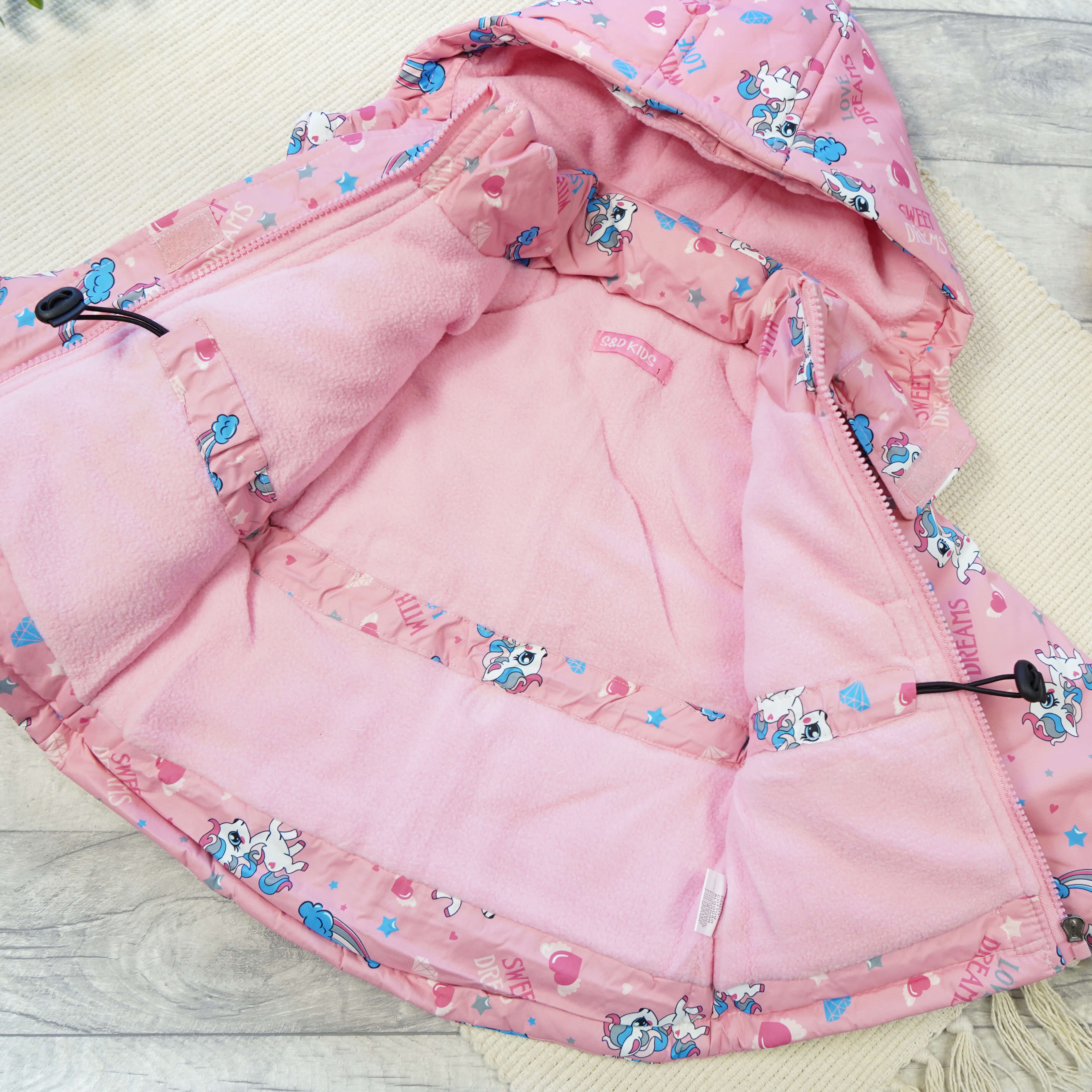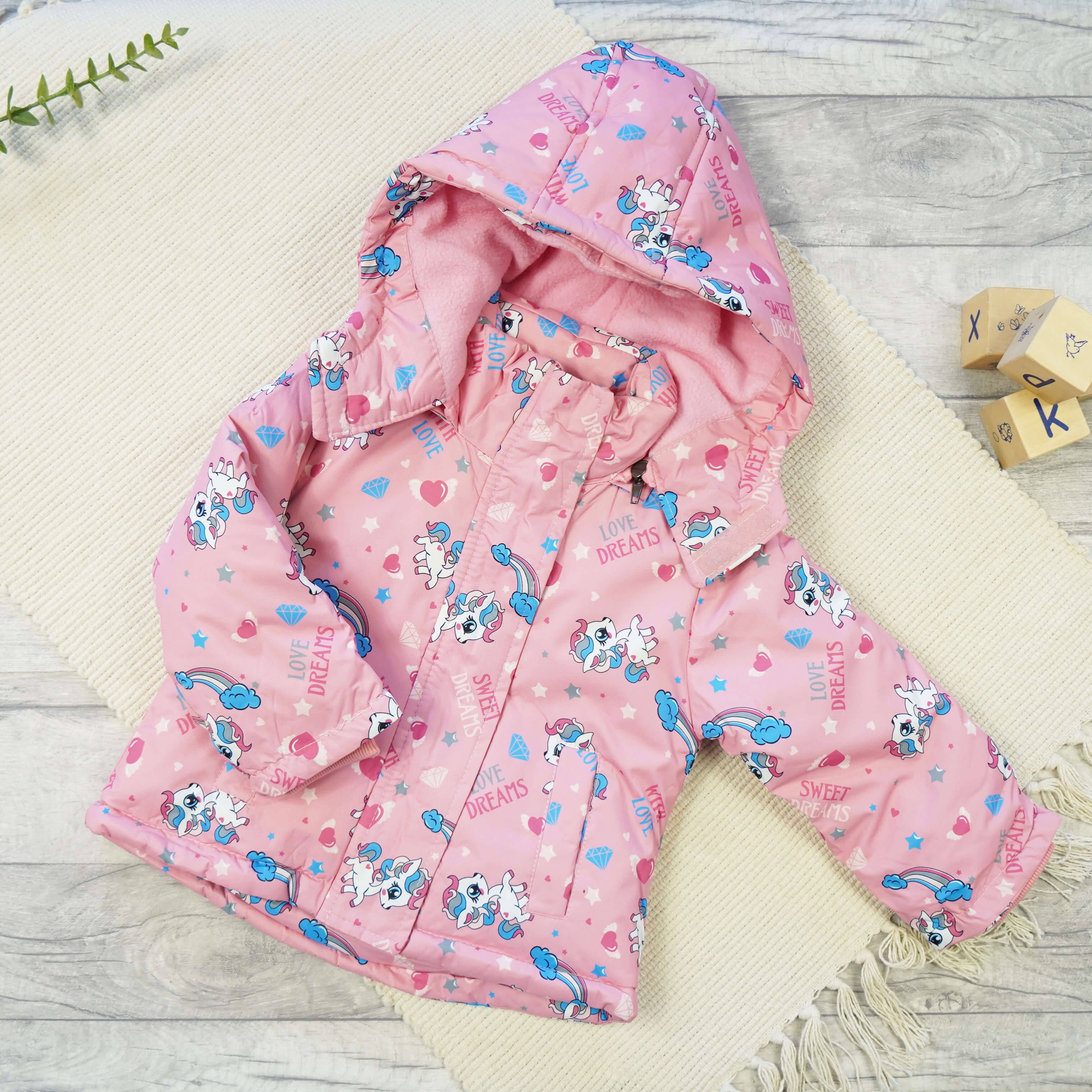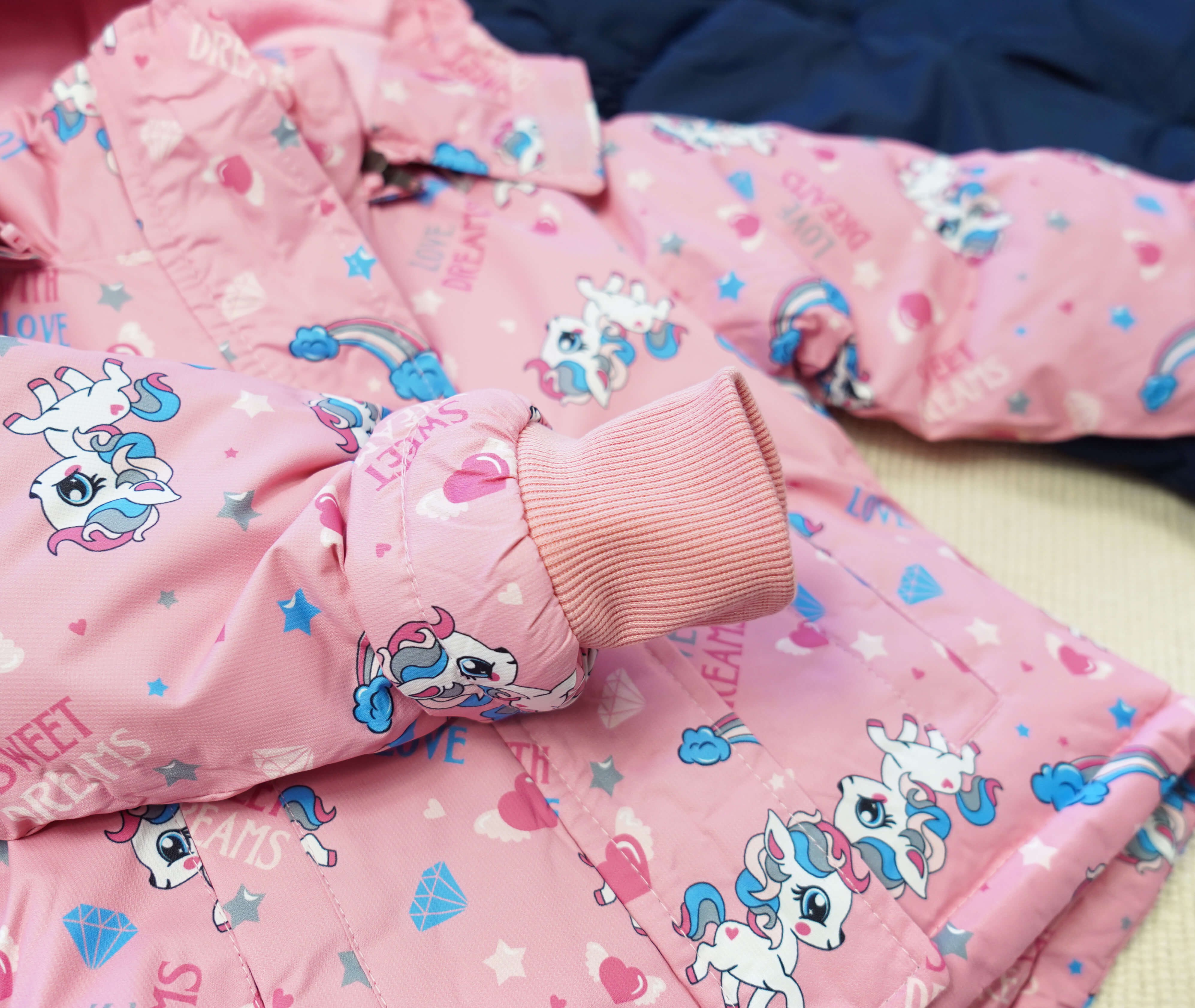 Dostępna w zestawie kurtka zimowa wykonana z warstwy nieprzemakalnej od strony zewnętrznej oraz ocieplona od wewnątrz miękkim polarem. Posiada ona stójkę osłaniającą szyję dziecka oraz odsuwany kaptur wyposażony w zapięcie na rzep. Kaptur kurtki również został ocieplony polarem. Kurtka zawiera dwie wbudowane kieszenie, wewnętrzny ściągacz w tali oraz rękawy wykończone gumką.