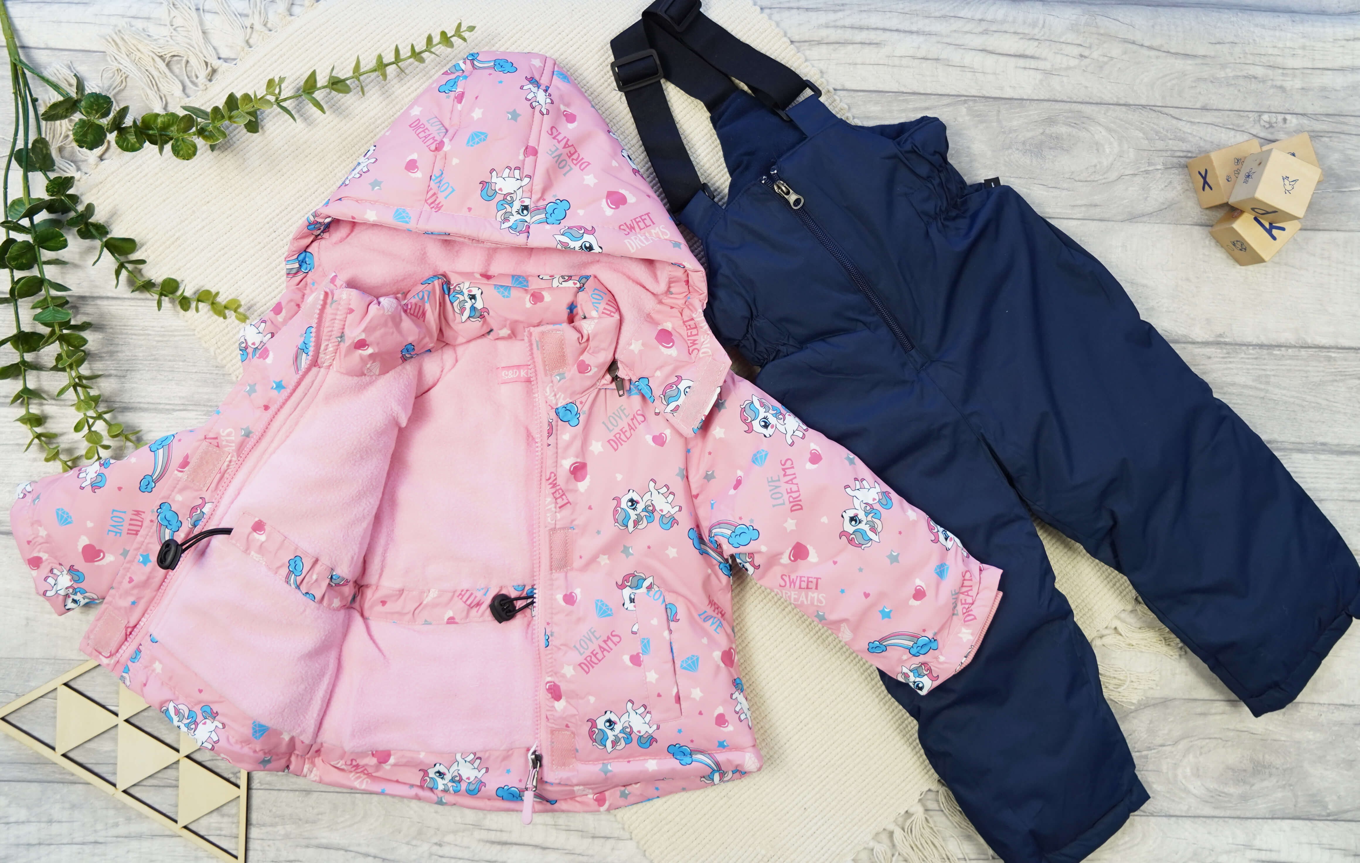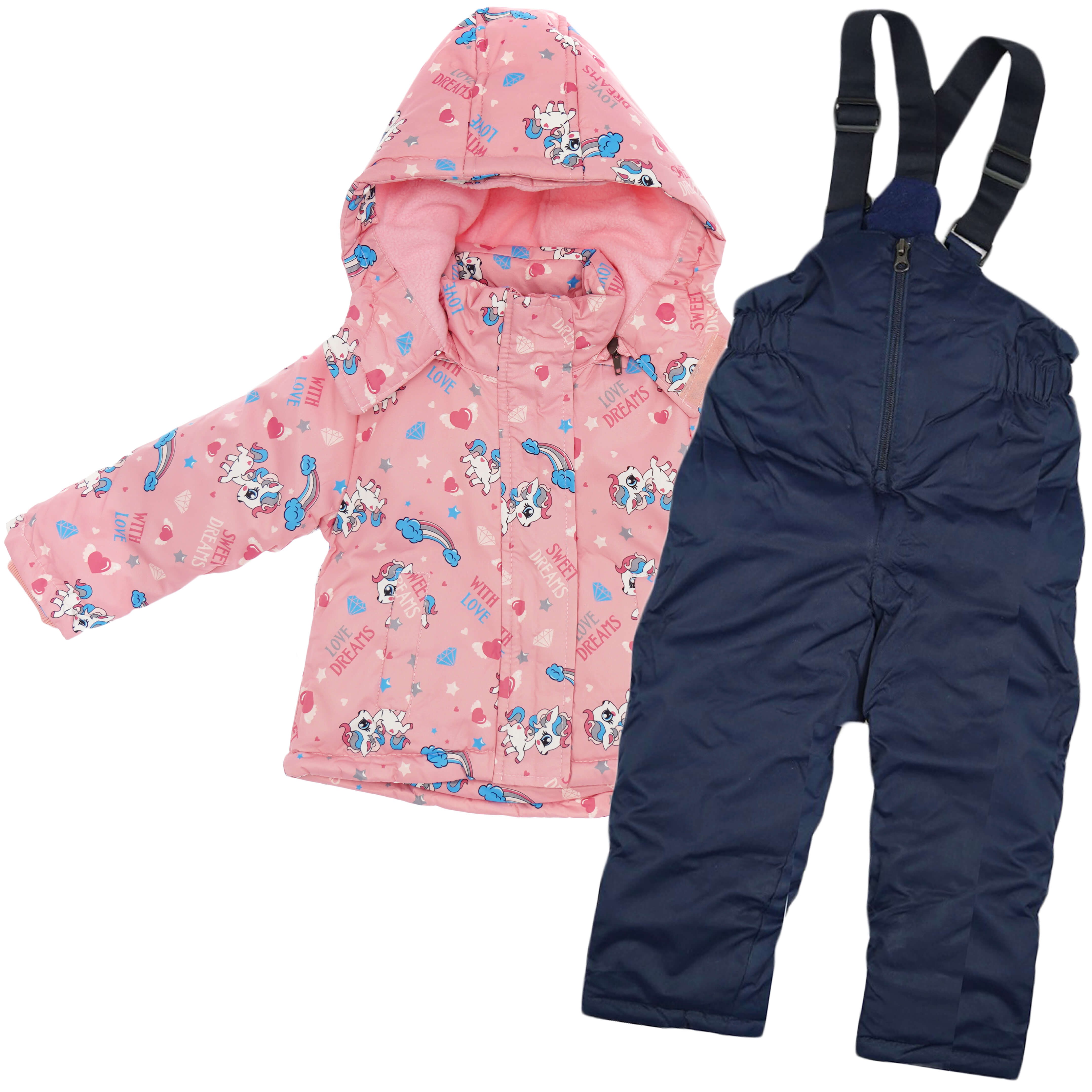 Kombinezon zimowy dla dziecka, w skład którego wchodzą: zapinana na suwak i rzepy ciepła, pudrowo różowa kurtka zimowa w kucyki oraz granatowe spodnie typu narciarskiego.