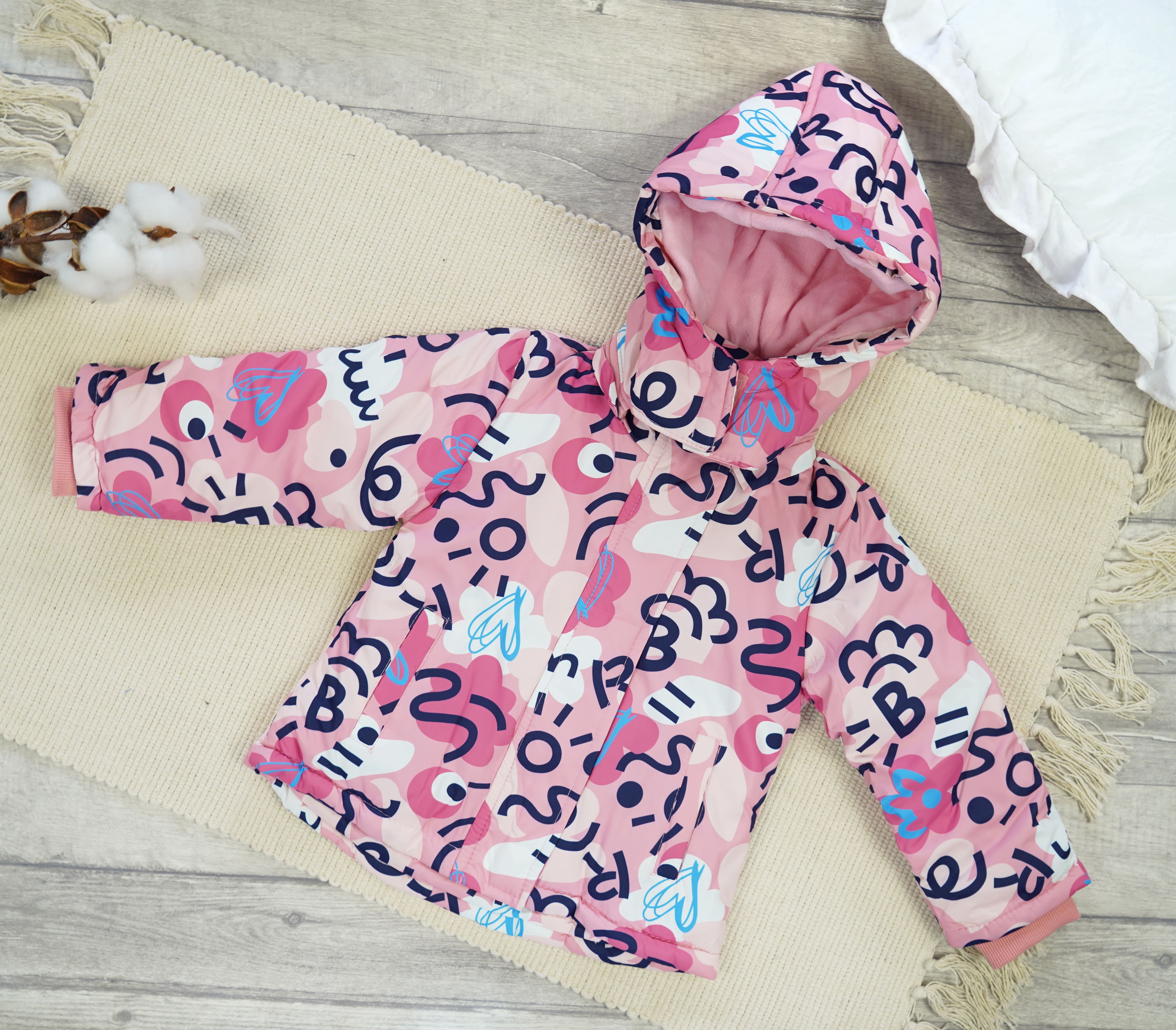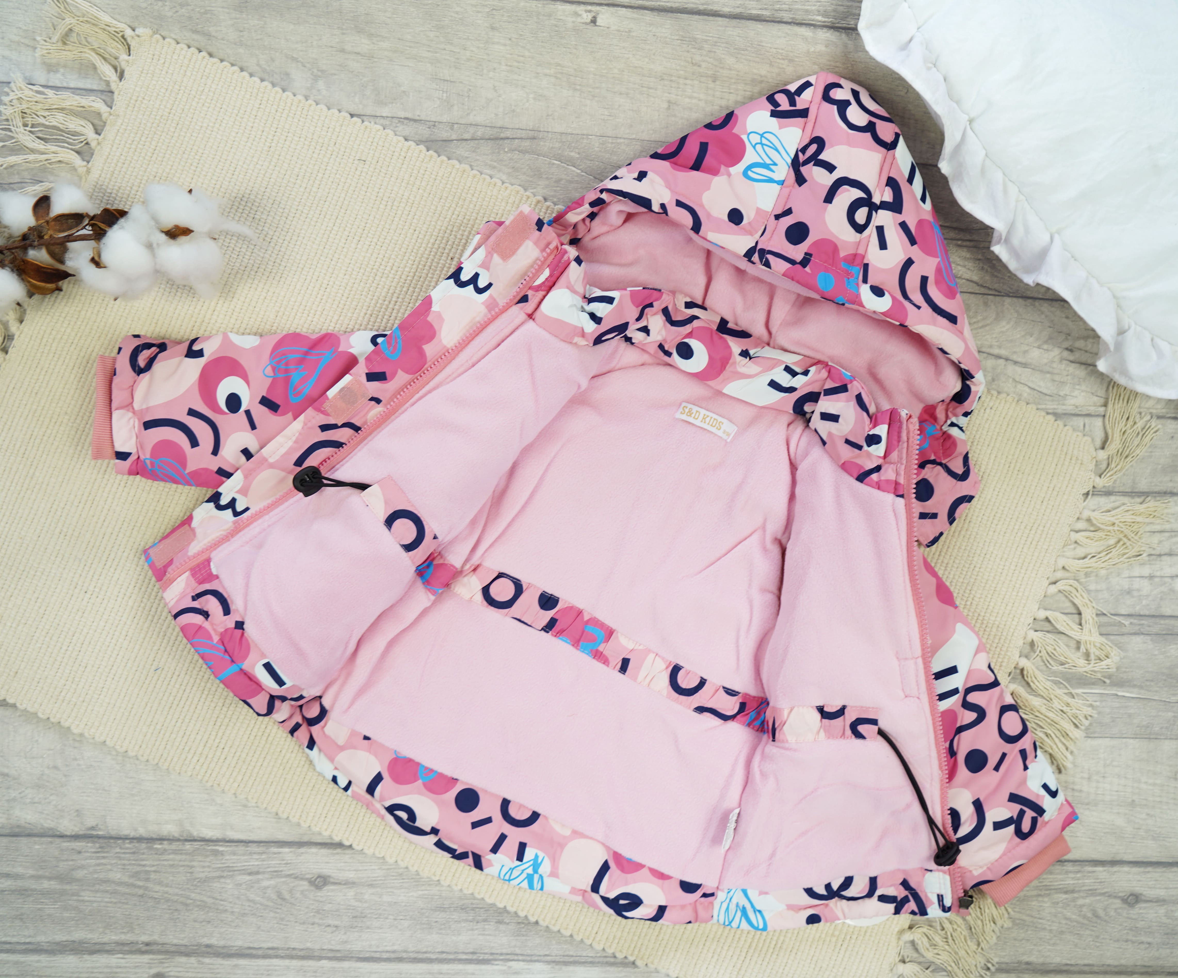 Dostępna w zestawie kurtka zimowa wykonana z warstwy nieprzemakalnej od strony zewnętrznej oraz ocieplona od wewnątrz miękkim polarem. Posiada ona stójkę osłaniającą szyję dziecka oraz odsuwany kaptur wyposażony w zapięcie na rzep. Kaptur kurtki również został ocieplony polarem. Dwie wbudowane kieszenie a także regulacja w talii po wewnętrznej stronie kurtki. Rękawy wykończone doszytym wewnątrz ściągaczem.