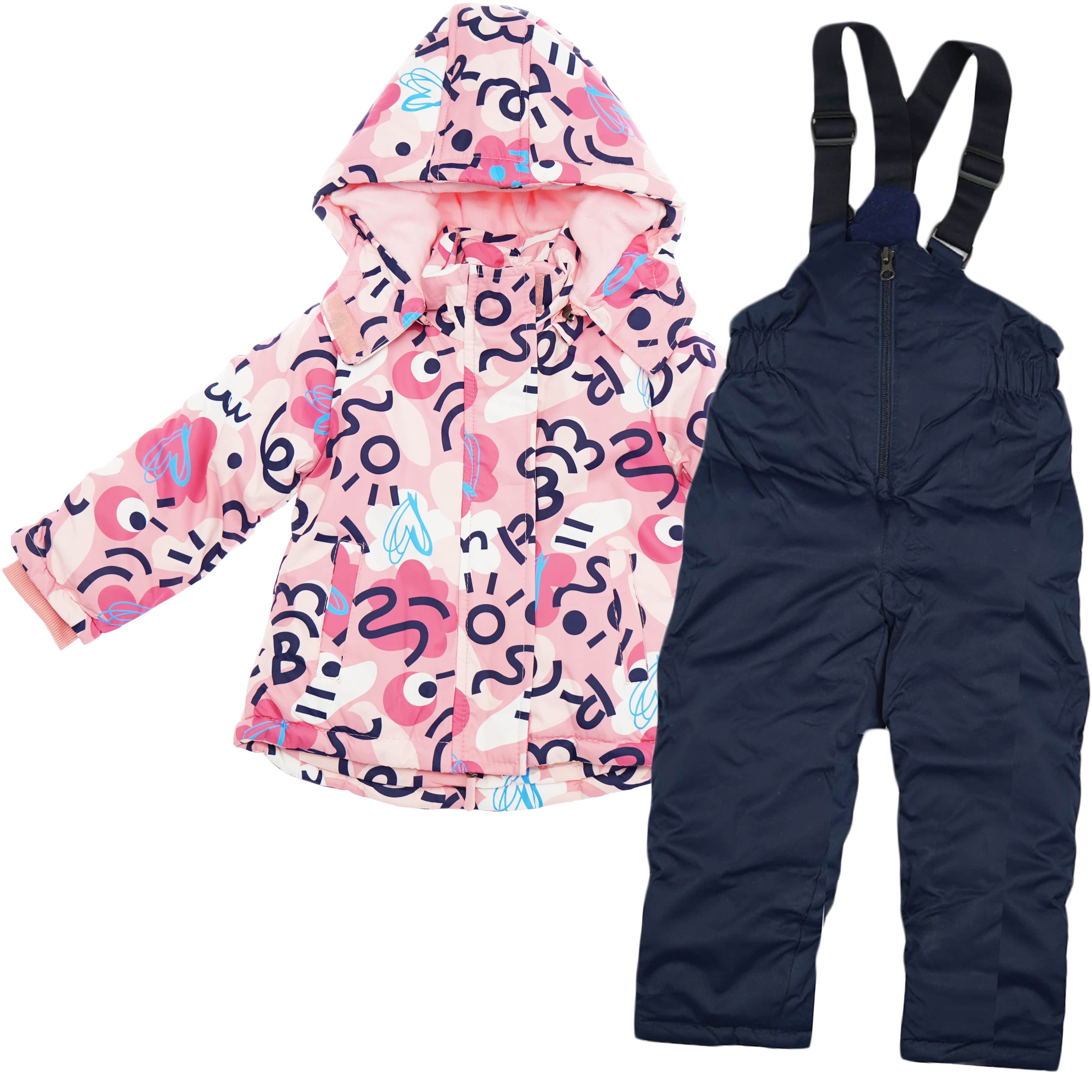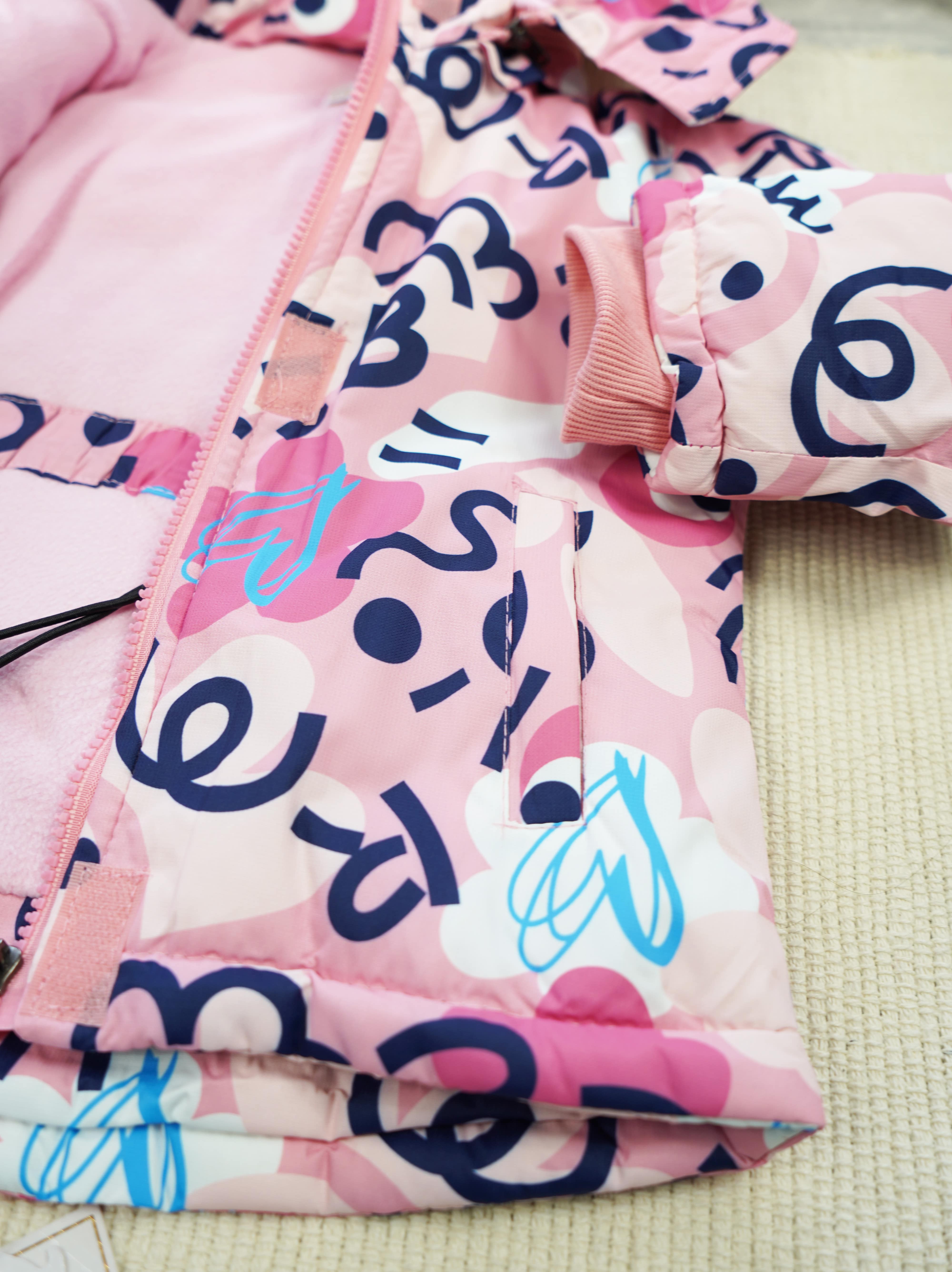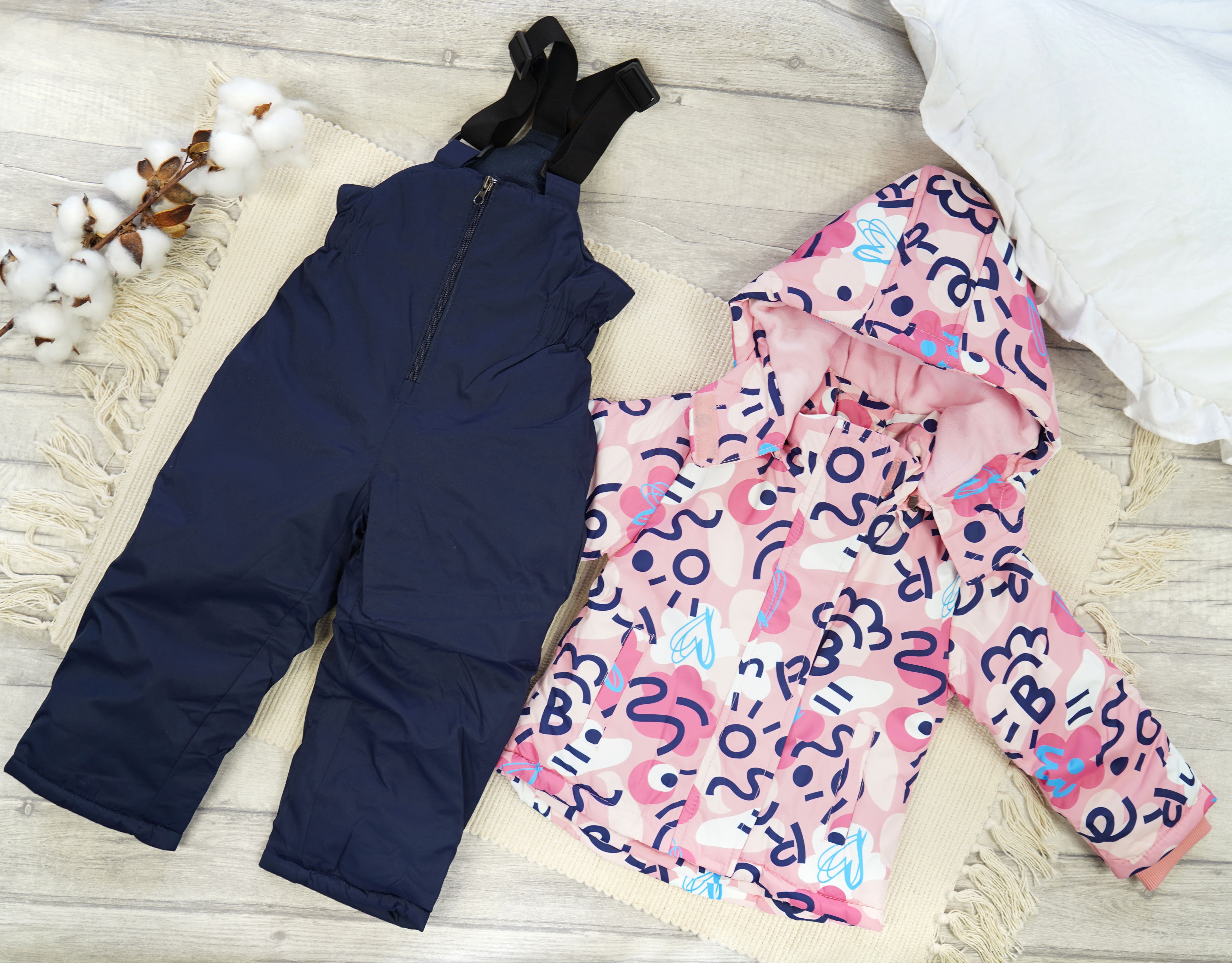 Kombinezon zimowy dla dziecka, w skład którego wchodzą: zapinana na suwak i rzepy ciepła, różowa kurtka zimowa we wzory oraz granatowe spodnie typu narciarskiego.