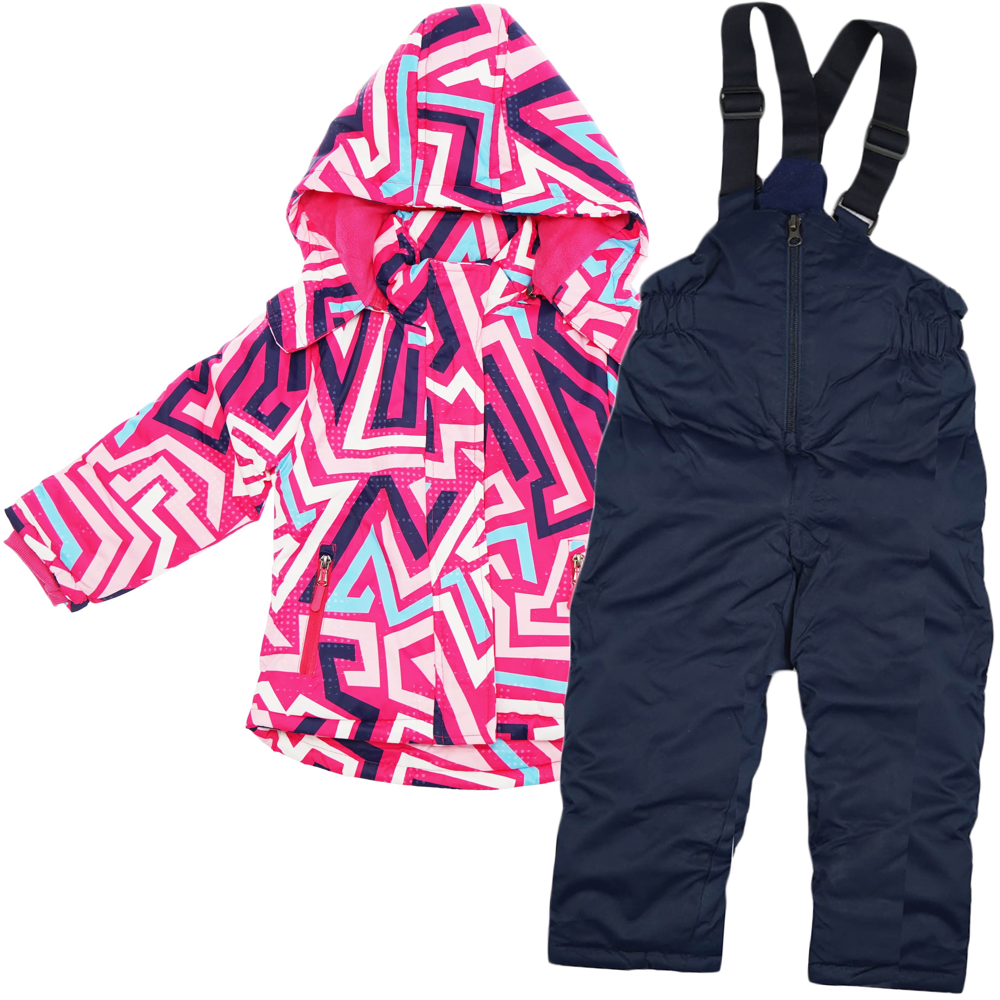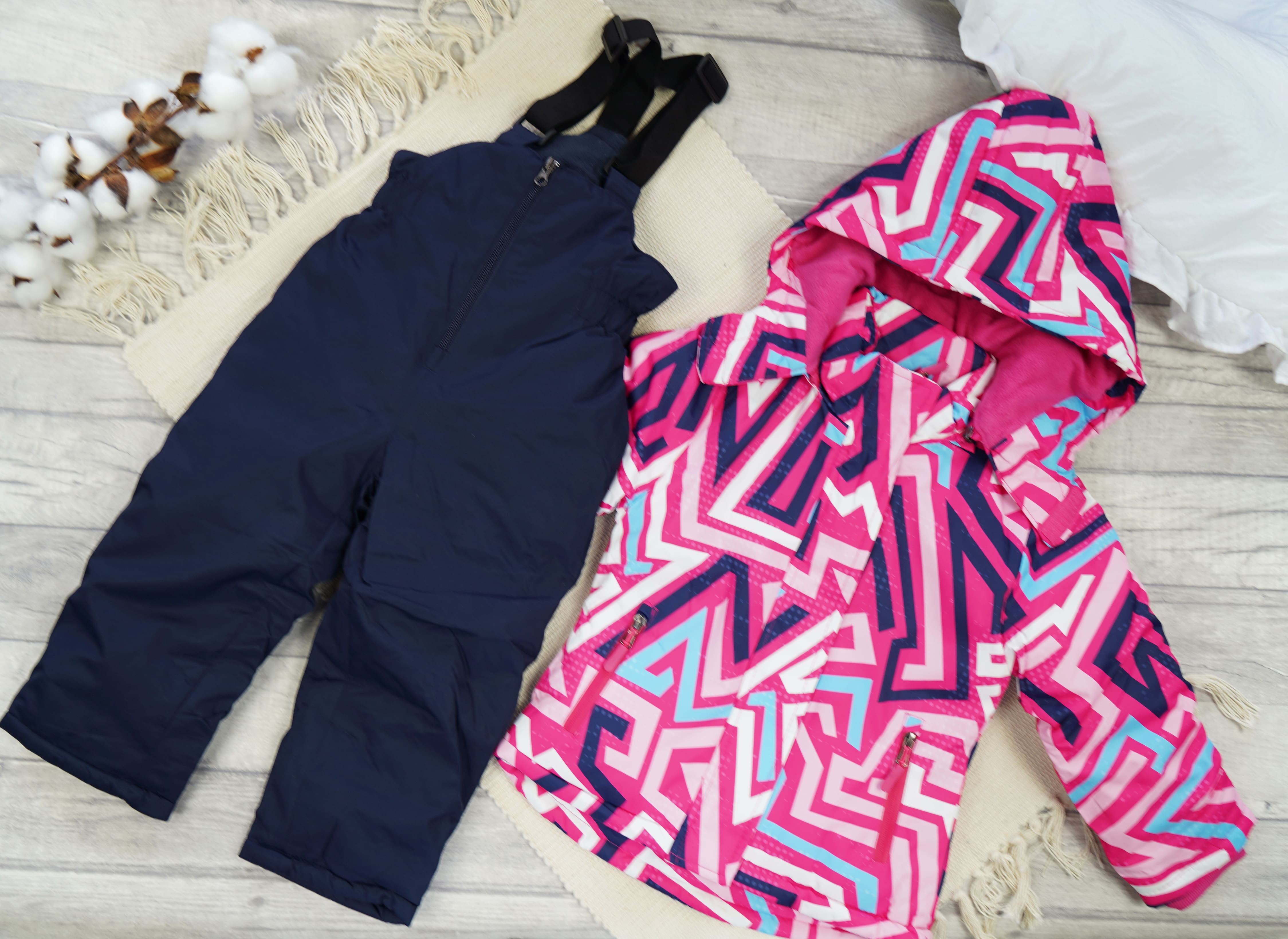 Kombinezon zimowy dla dziecka, w skład którego wchodzą: zapinana na suwak i rzepy ciepła, amaratnowa kurtka zimowa we wzory oraz granatowe spodnie typu narciarskiego.