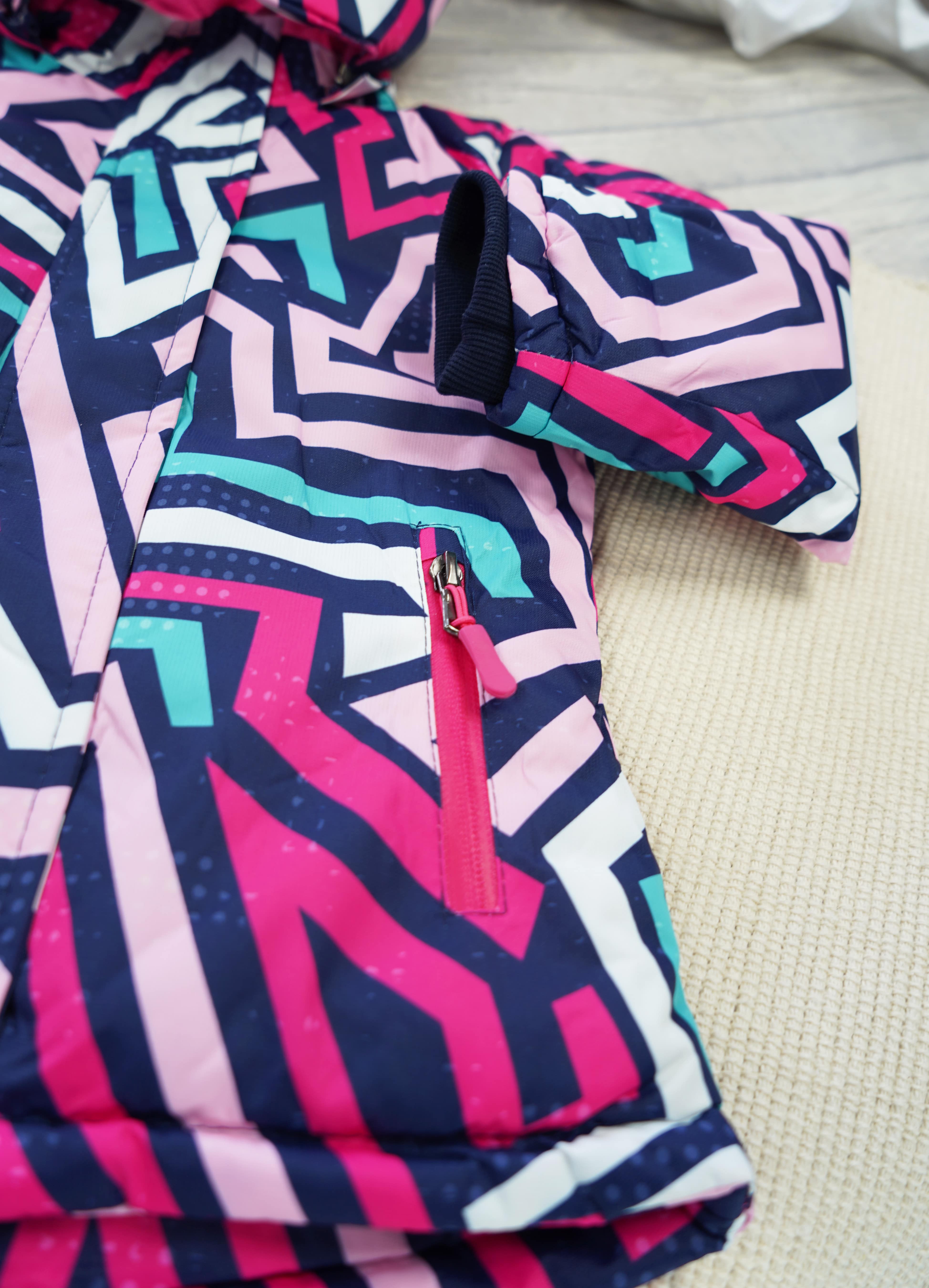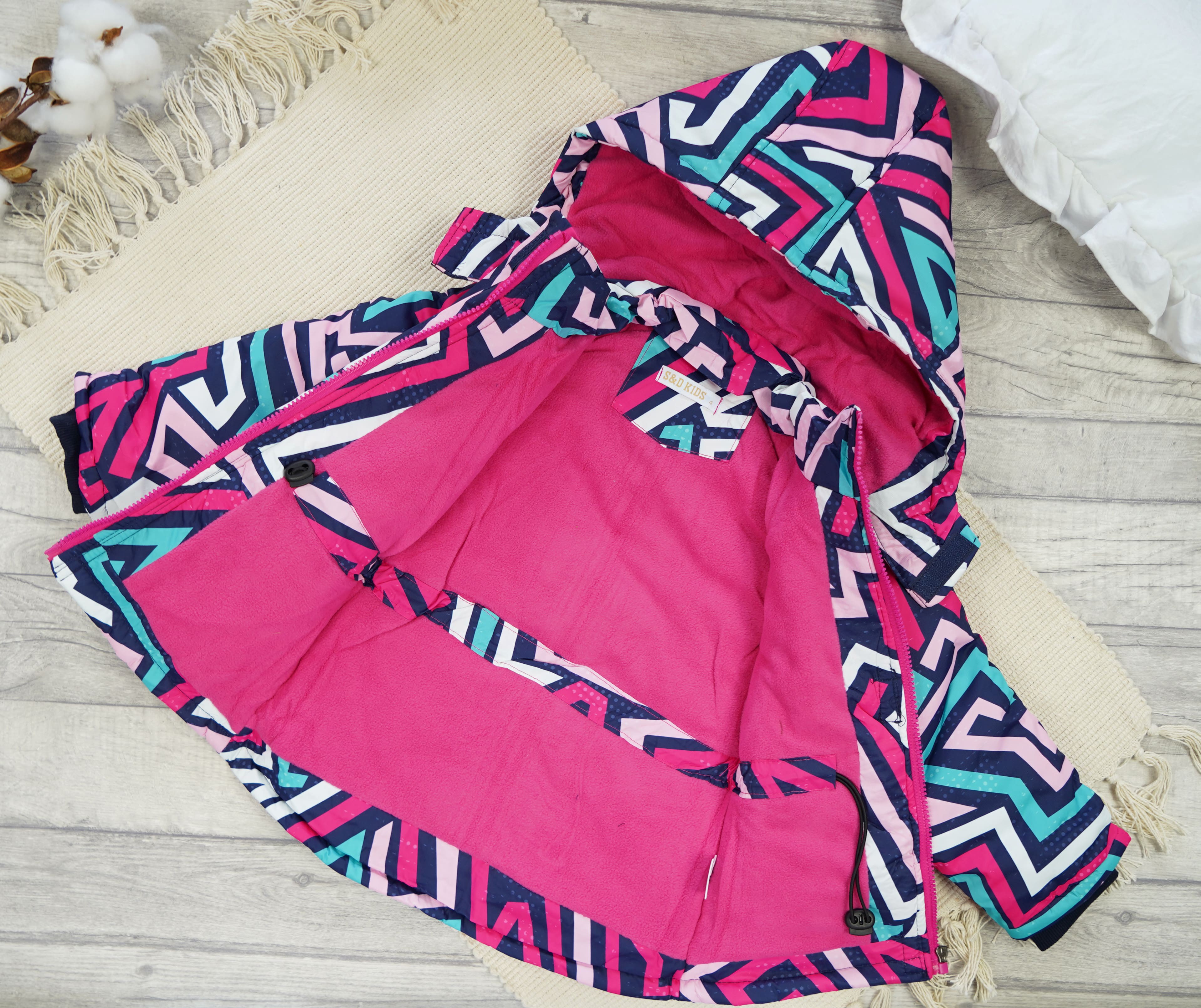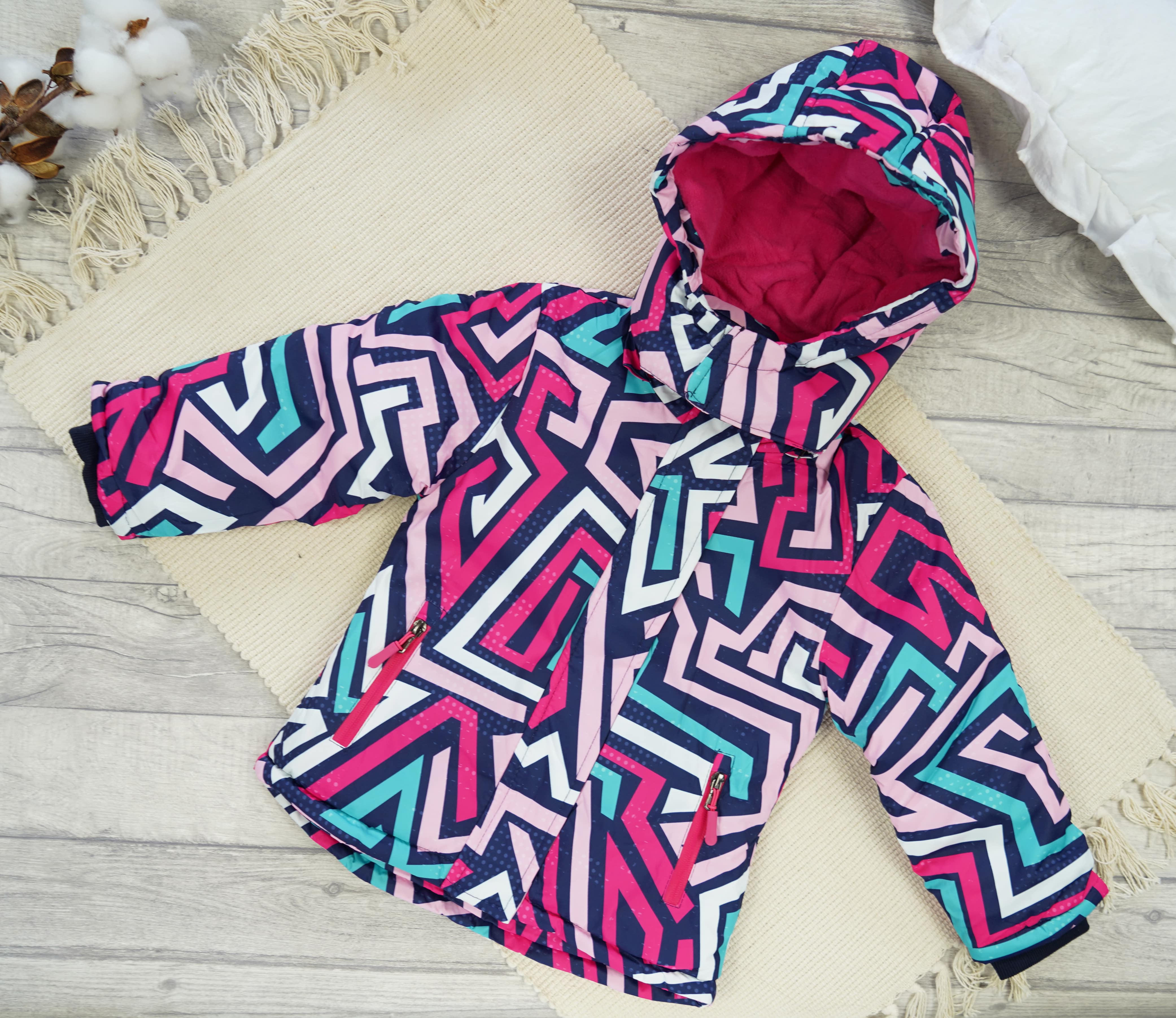 Dostępna w zestawie kurtka zimowa wykonana z warstwy nieprzemakalnej od strony zewnętrznej oraz ocieplona od wewnątrz miękkim polarem. Posiada ona stójkę osłaniającą szyję dziecka oraz odsuwany kaptur wyposażony w zapięcie na rzep. Kaptur kurtki również został ocieplony polarem. Kurtka posiada dwie wbudowane kieszenie na zamek a także regulację w talii. Rękawy wykończone doszytym wewnątrz ściągaczem.